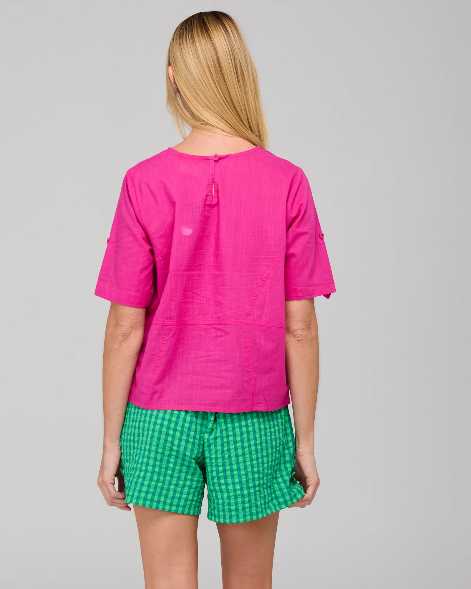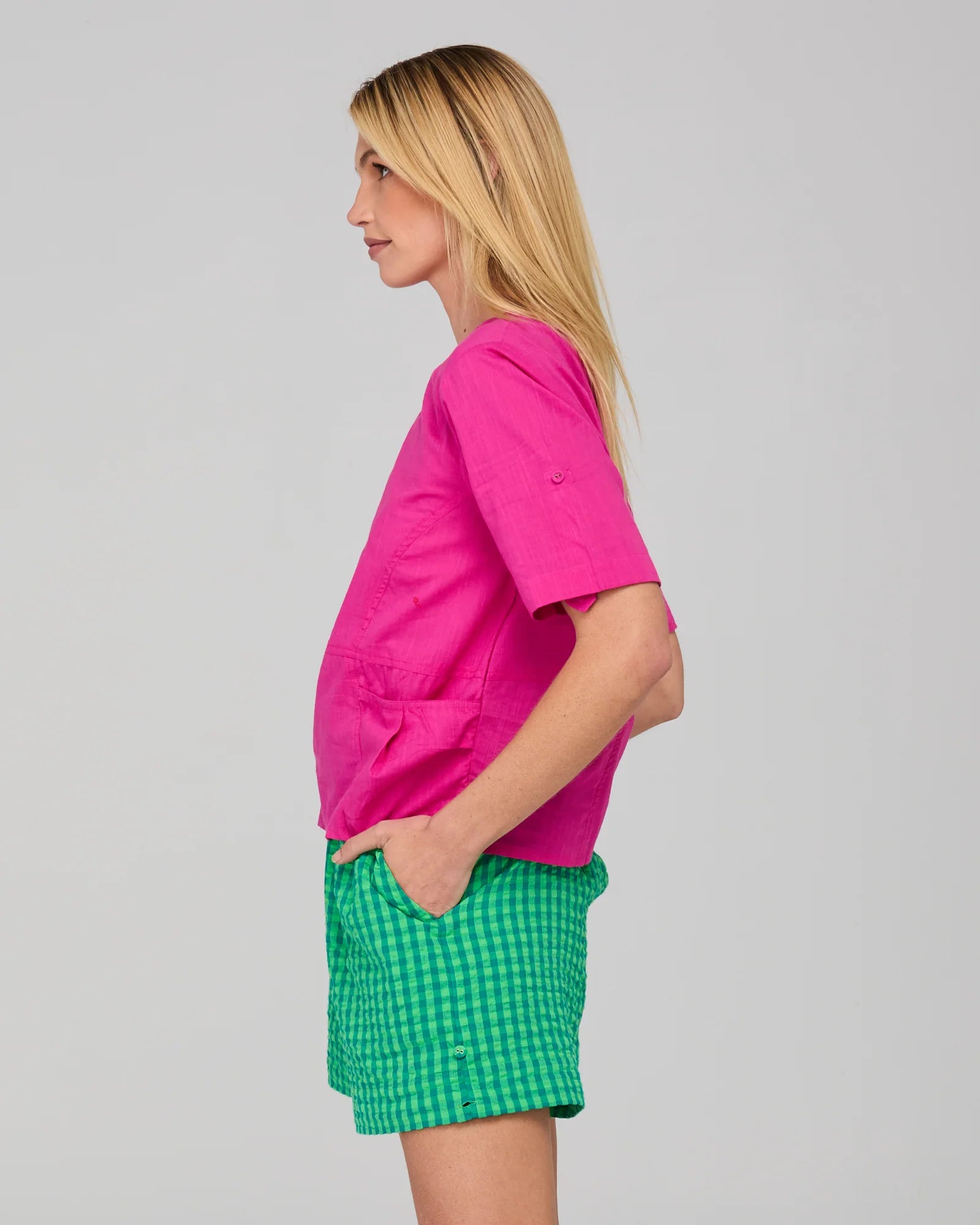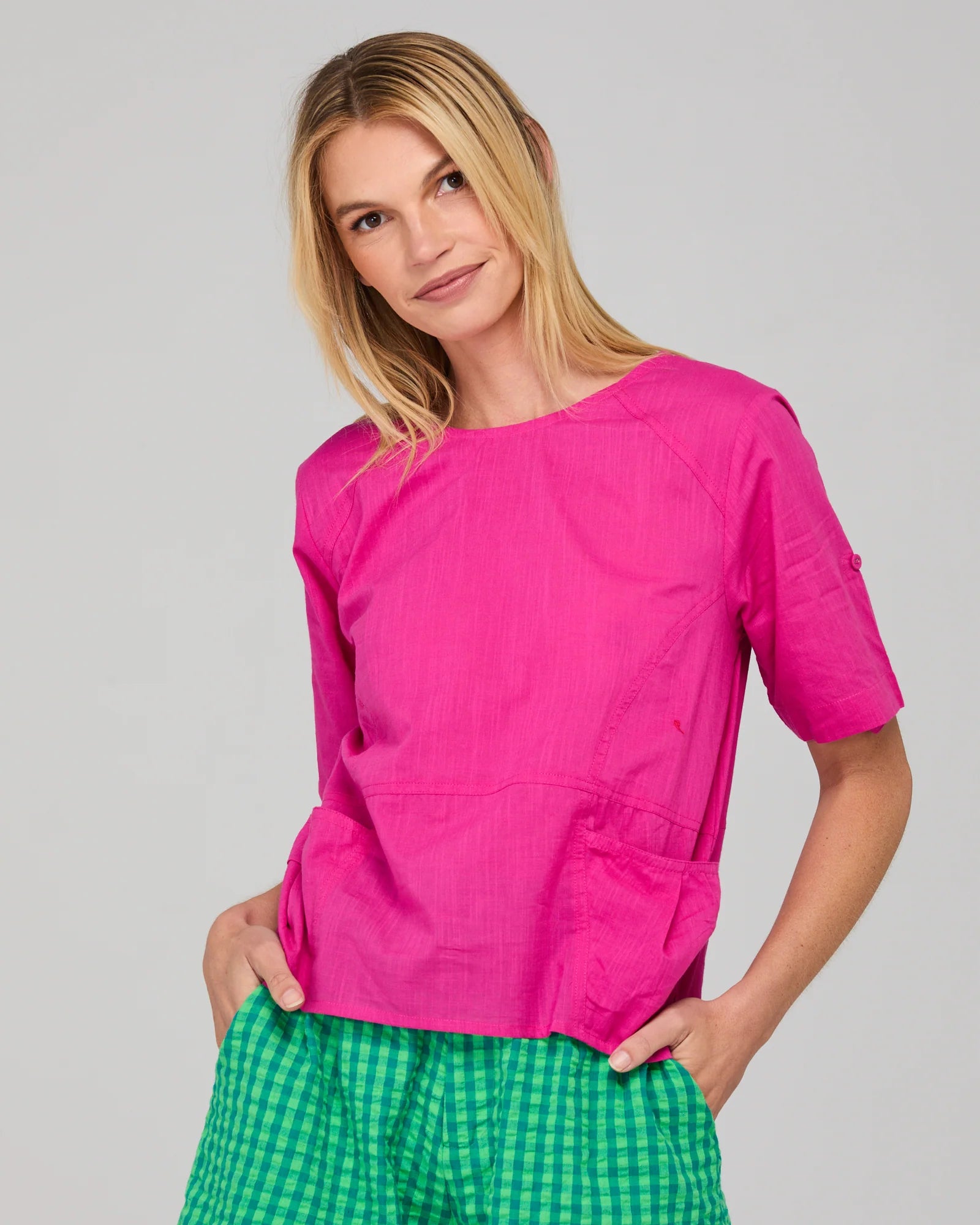 100% cotton, short sleeves, button tab on sleeve to wear rolled up or rolled down, button closure at back neckline, two front pockets with pleat detail, seam and panel detail for signature Guru look, high scooped neckline, unlined.