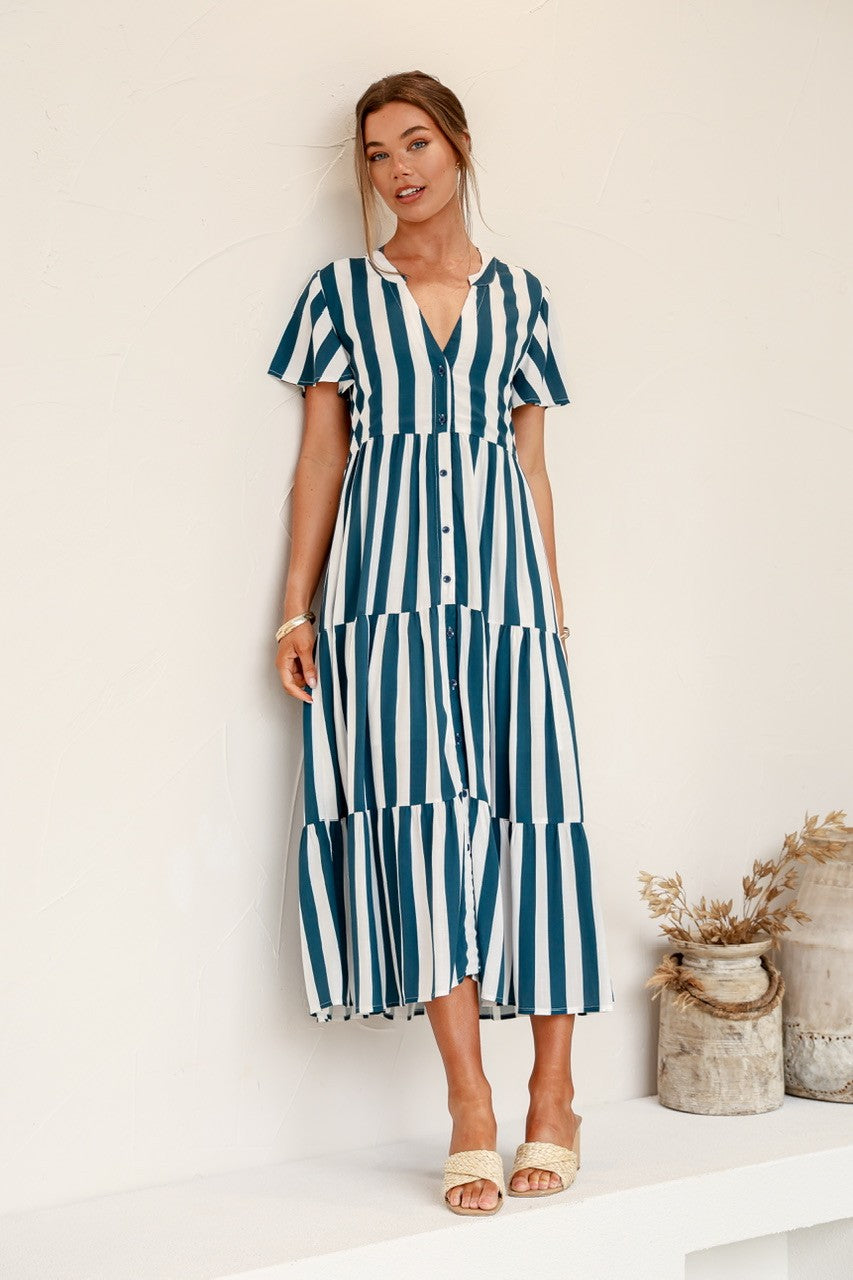 Embrace effortless style with the Coastal Stripe Dress in Navy and White. Featuring a flattering V-neckline and a playful button-through front, this dress enhances your silhouette with tiered layers that add movement and charm. Short flutter sleeves bring a light, breezy feel, perfect for warm days. Whether you're strolling the beach or enjoying a casual outing, this dress combines comfort with a chic, coastal vibe