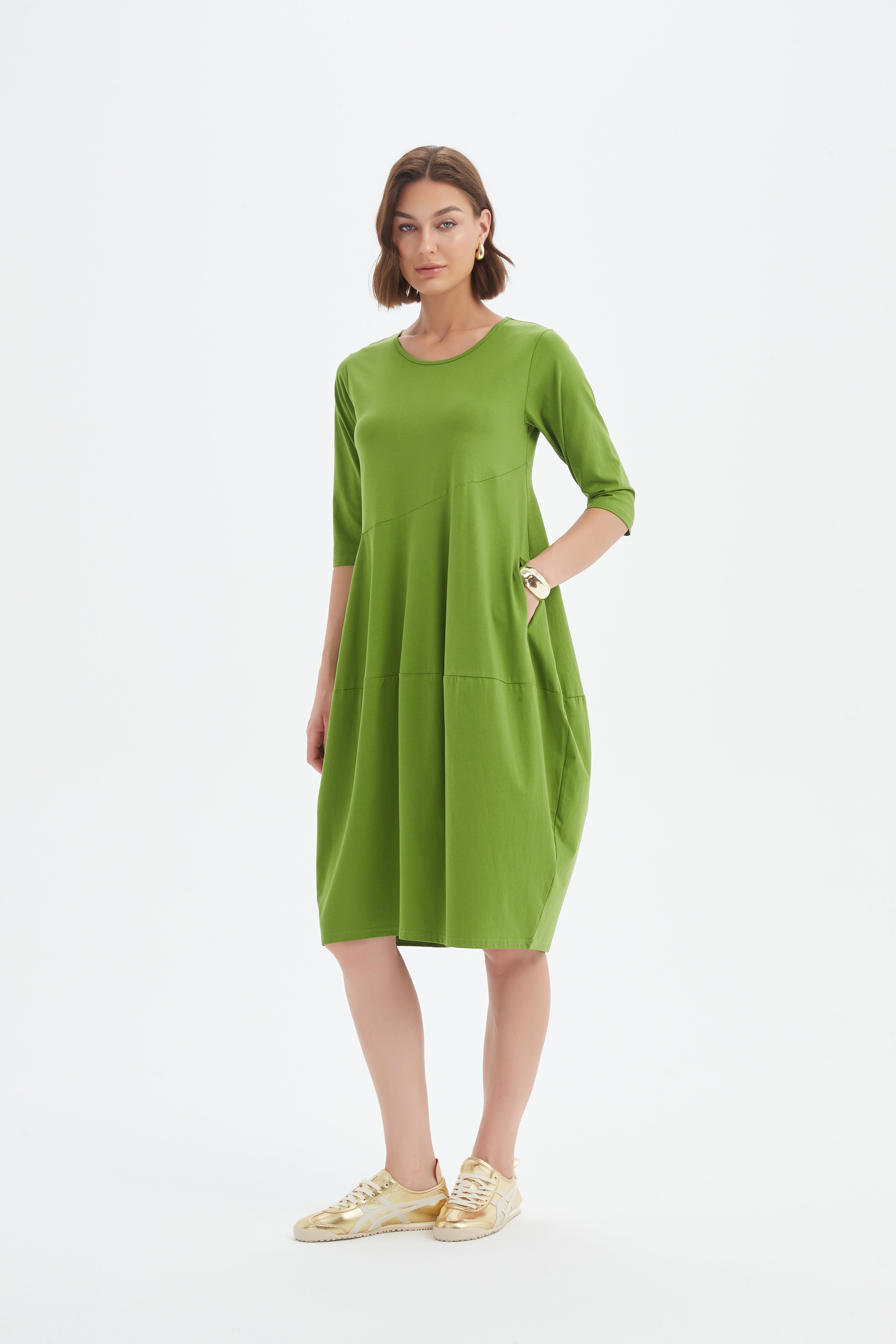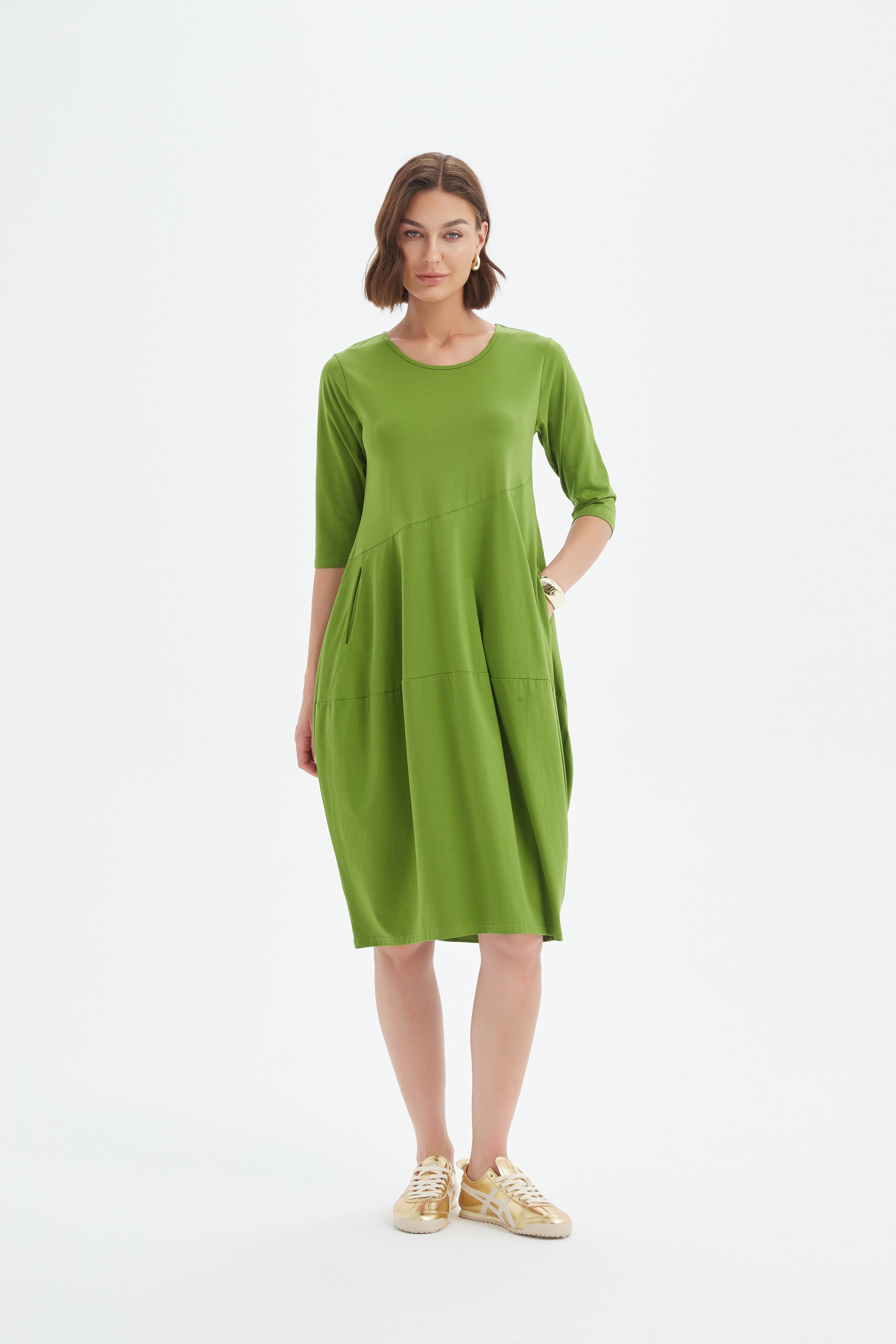 The popular Diagonal dress is in an elbow length sleeve variation showcases a fitted bust and ballooned skirt with pockets on either side. Designed with warmer months in mind, this fabric is lightweight and perfect for staying cool. It provides excellent breathability and ensures a comfortable experience throughout the day.