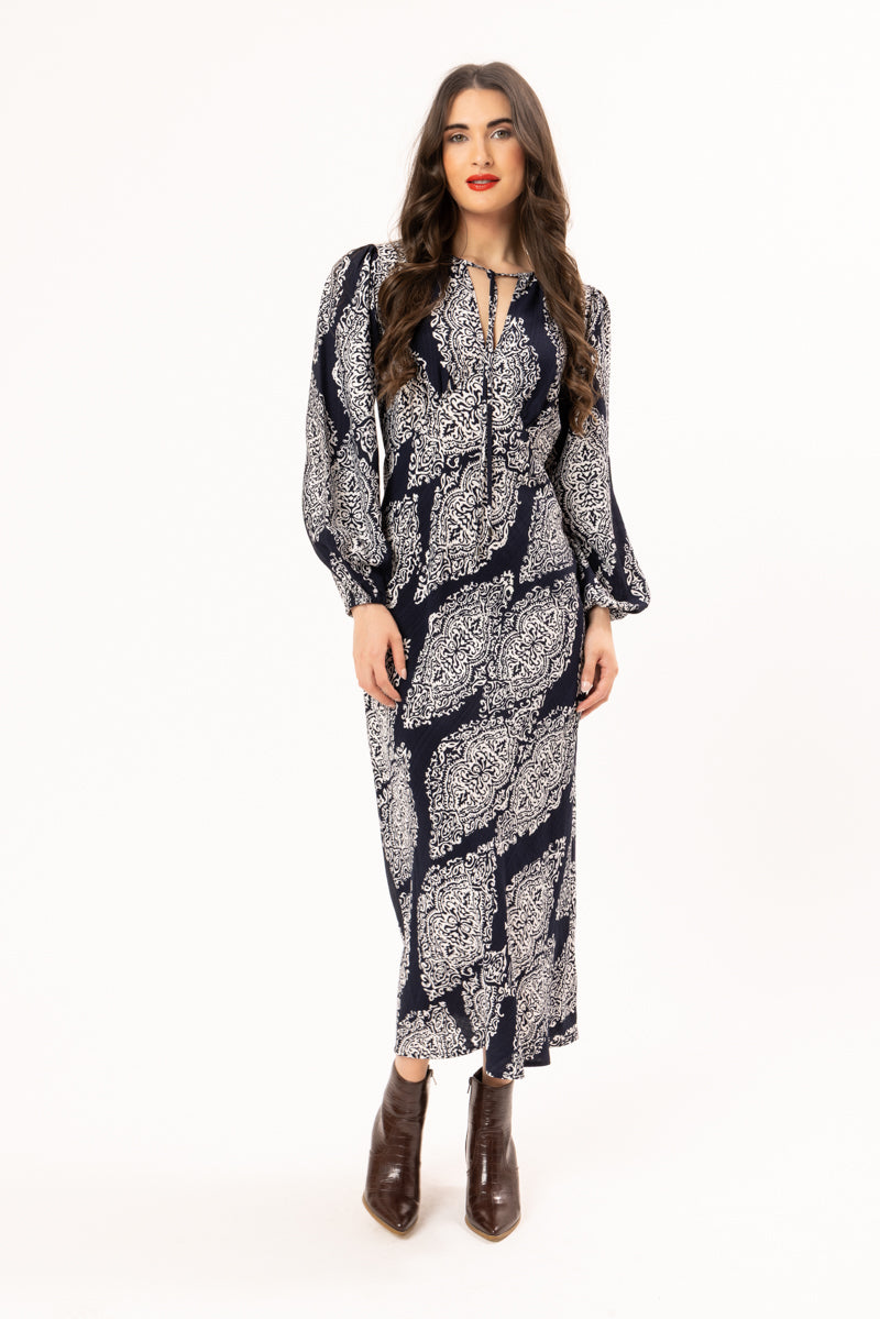 The Navy Whisper dress embodies understated luxury with its refined long-sleeve silhouette and midi length. Crafted in a sophisticated dark navy print, this piece transitions effortlessly from day to evening occasions. The elegant design flatters the figure while maintaining a timeless appeal that works season after season. Perfect for those who appreciate quality and subtlety in their wardrobe, this dress proves that true elegance never goes out of style.
