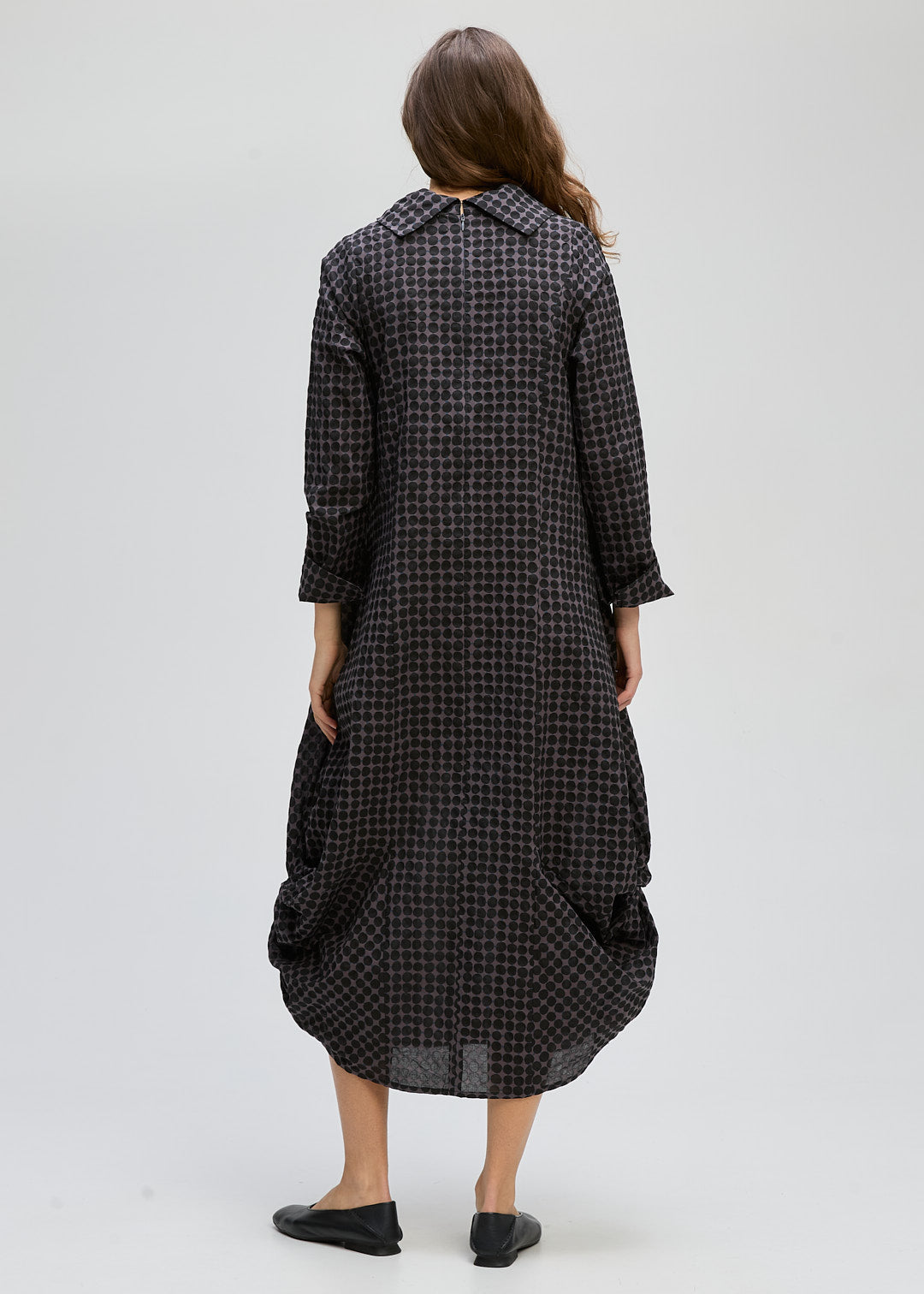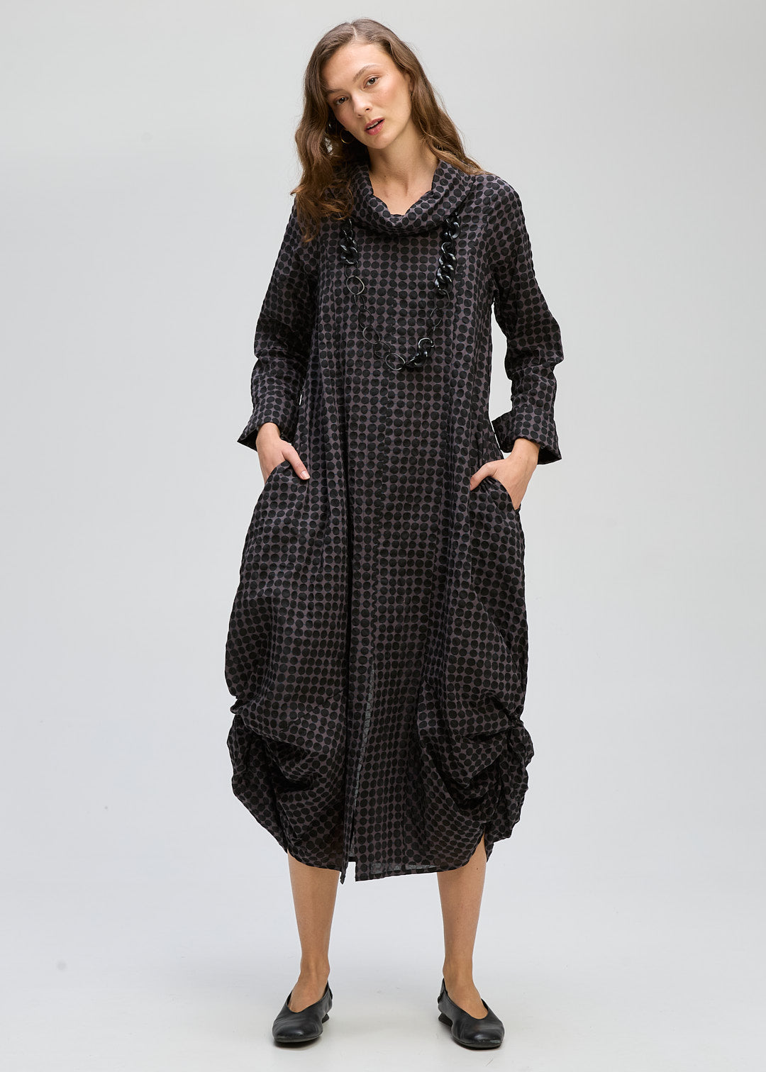 This stunning Poker Dot Dress in Black Spot combines timeless style with practical design. The elegant cowl neck drapes beautifully, while long sleeves showcase intricate ruching twists along both sides for a modern, textured look. The discreet back zip makes dressing effortless, and the silhouette works wonderfully layered under a vest for added depth and versatility