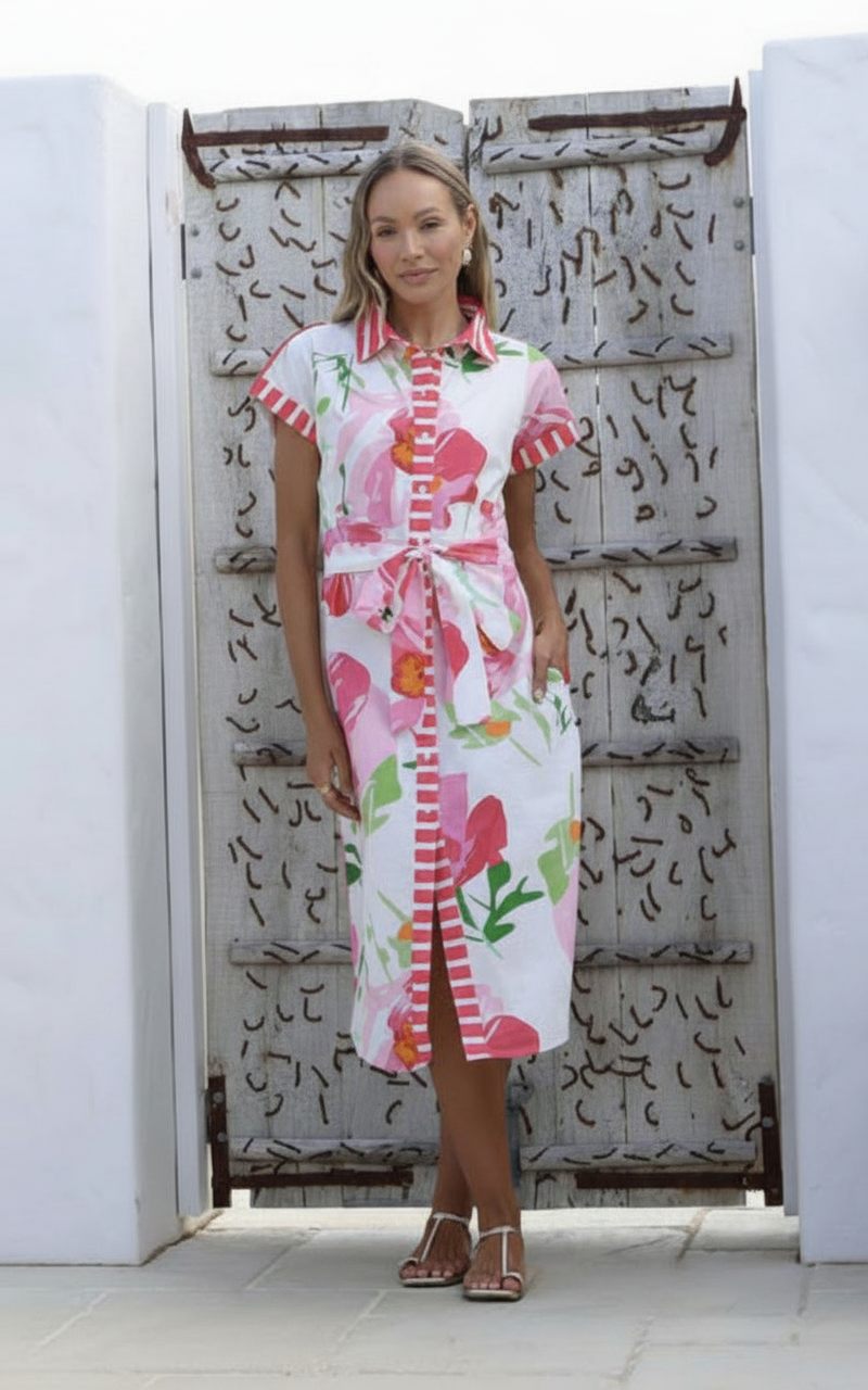 Effortlessly transition from day to night in this versatile shirt dress. Featuring a classic button-front design with crisp short sleeves and a tailored collar, it's the perfect piece for any occasion. The distinctive striped trim adds a touch of contemporary style while keeping the look timeless and refined. Comfortable enough for casual wear yet polished enough for work or weekend outings, this white floral shirt dress is a wardrobe essential that works harder than you'd expect