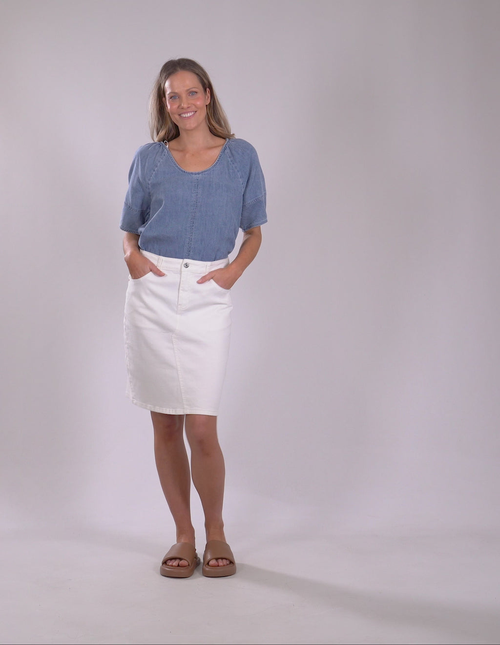 The Belle Denim Skirt in Vintage White offers a timeless knee-length silhouette perfect for effortless style. Designed with practical side and back pockets, it combines classic charm with everyday functionality. This versatile skirt pairs seamlessly with your favourite tops, making it an essential addition to your wardrobe for both casual outings and more polished looks