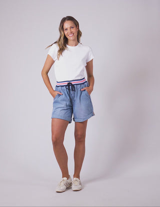 Effortlessly transition from summer days to casual nights in these Bohdi Denim Shorts. The mid blue wash delivers timeless appeal, while the distinctive striped waistband adds a touch of personality to your everyday look. Practical pockets keep your essentials within reach, making these shorts as functional as they are stylish. Perfect for pairing with your favourite tee or tank, they're the versatile piece your wardrobe has been waiting for.