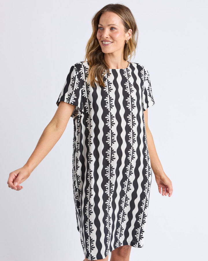 The Casa Shift Dress in Black with Marshmallow Casa Print offers a timeless silhouette with its classic shift style. Featuring short sleeves and a knee-length cut, this dress combines comfort and effortless elegance, perfect for day-to-night wear. Its versatile design ensures you stay stylish and confident wherever you go.