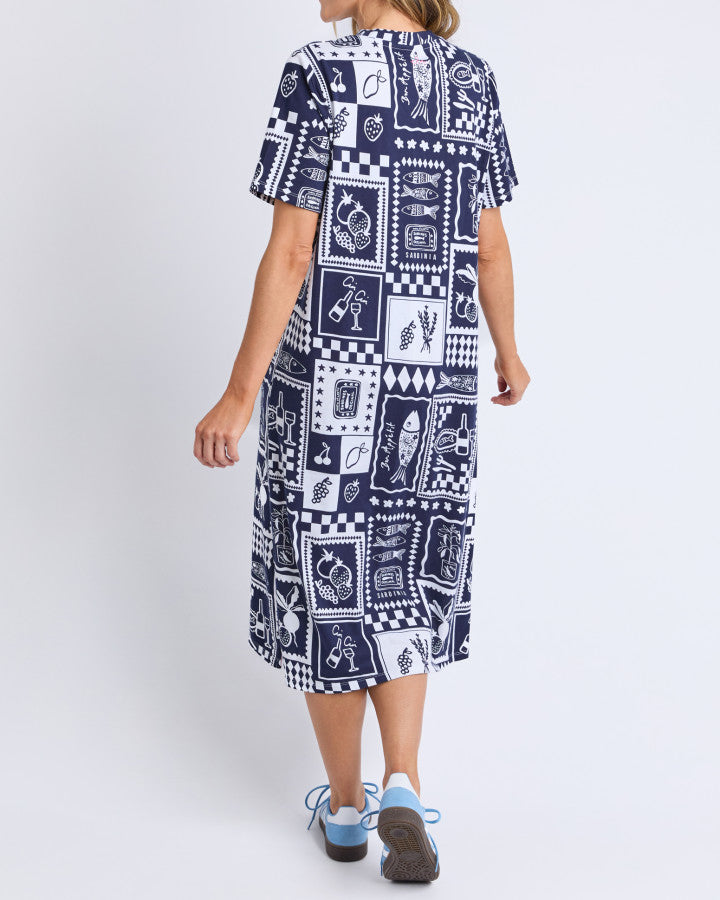 The Chin Chin Dress in navy offers effortless style with its unique yardage pattern. Designed with comfort in mind, this simple tee dress features short sleeves and convenient side pockets. Side splits add a flattering touch, allowing easy movement throughout your day. Perfect for casual outings, it combines practicality with a stylish edge for your wardrobe