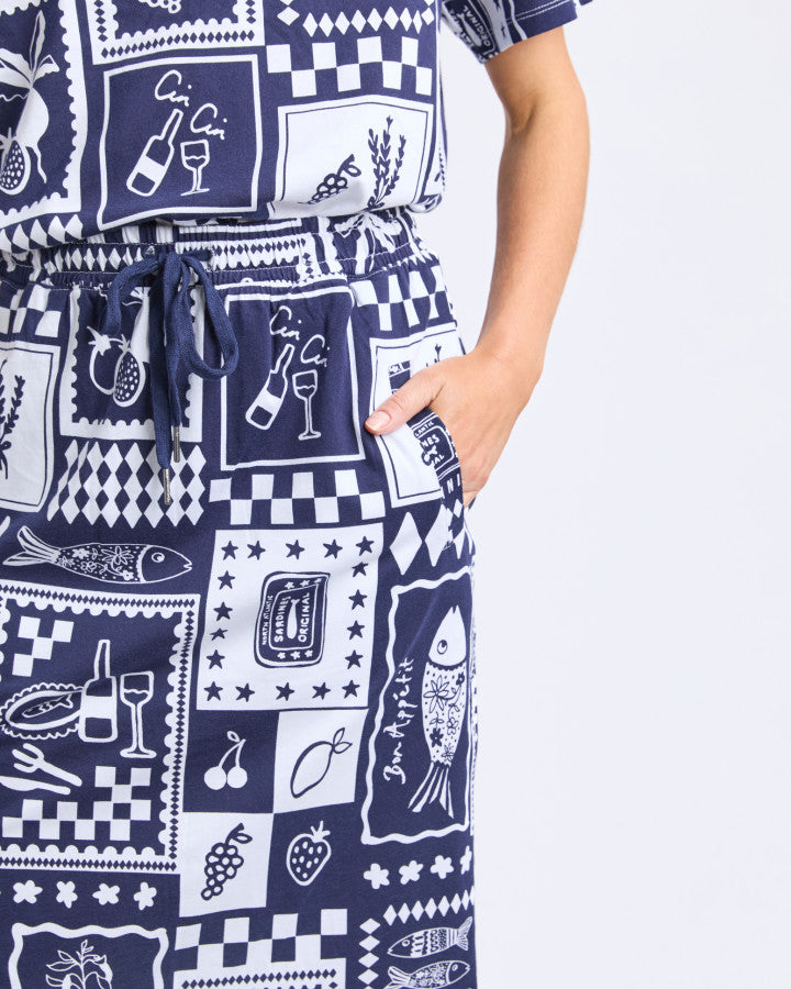 Enjoy effortless style with the Chin Chin Skirt in Navy. Designed for easy wear, it features a comfortable elasticated waist with adjustable ties for a perfect fit. The knee-length cut offers a flattering silhouette that's both versatile and chic, ideal for casual outings or dressier occasions. Embrace comfort and style without compromise