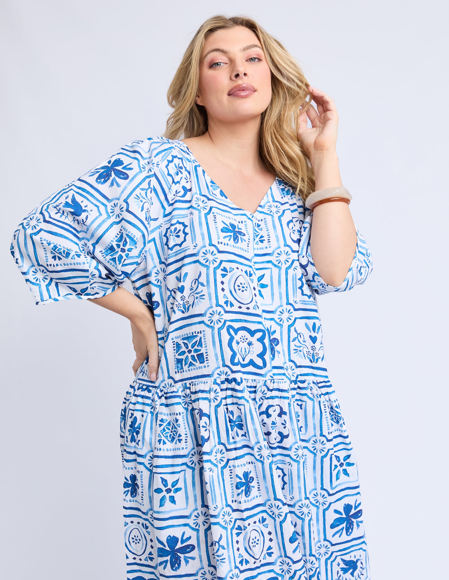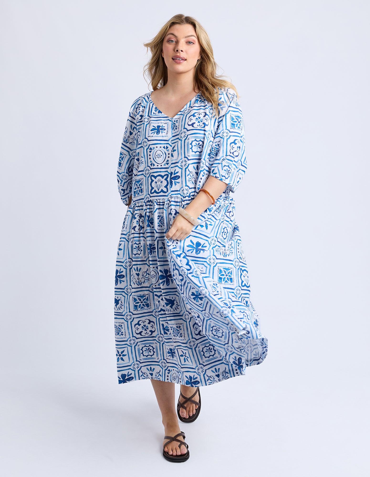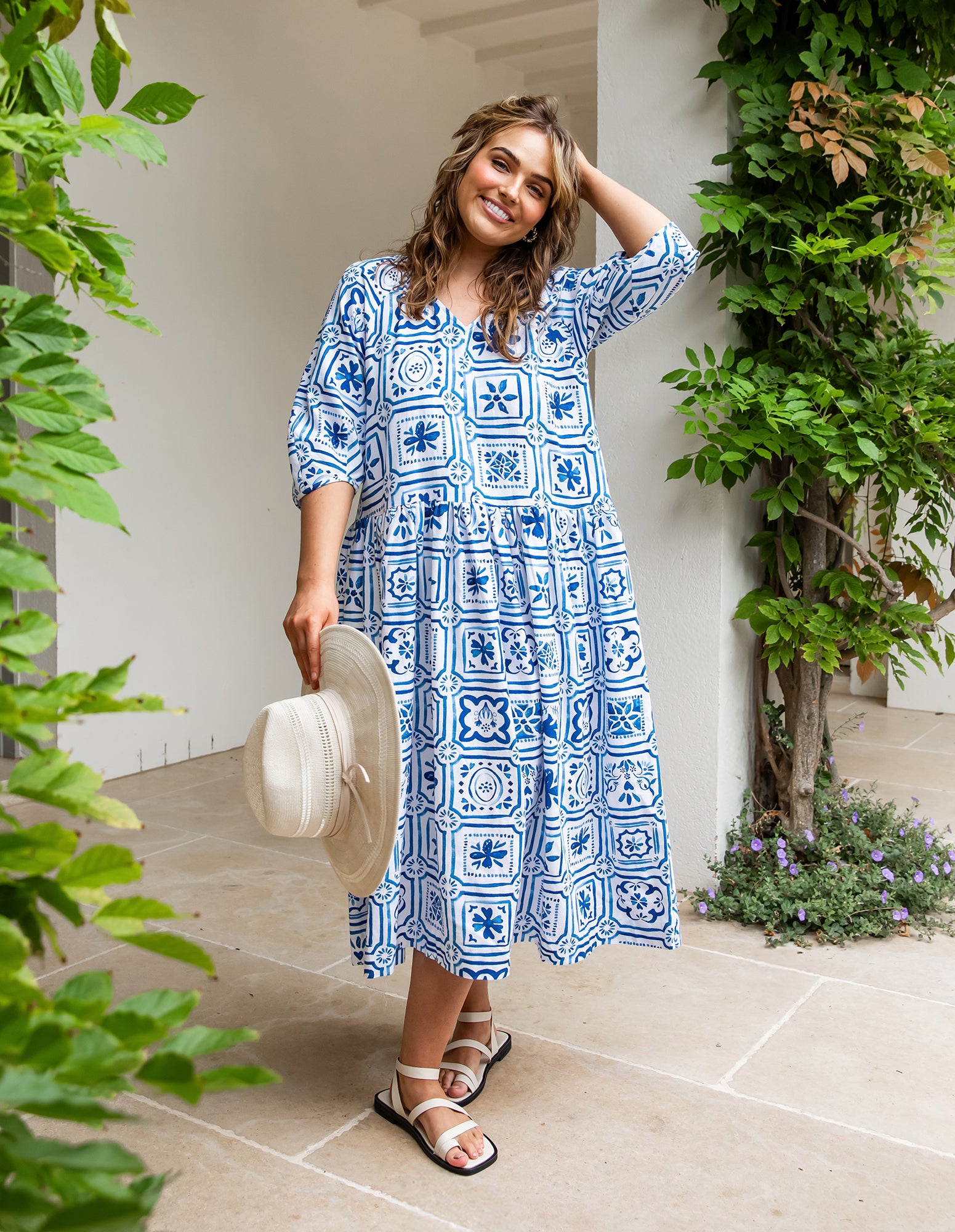 The Dolce Tile Midi Dress in Ocean Tile Print offers a unique exclusive pattern paired with a relaxed, mid-length silhouette. Designed for versatile wear, this dress effortlessly adapts to your style, making it perfect for any occasion throughout the week. Embrace comfort and elegance with a look that’s effortlessly chic and uniquely yours