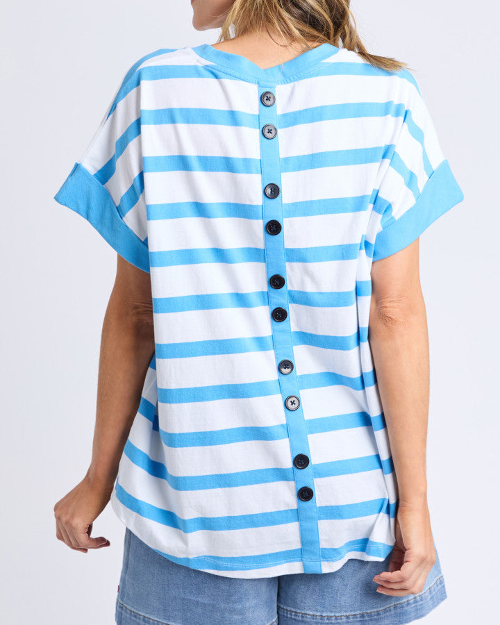 Experience casual elegance with the Maddison Tee Shirt in Azure Blue and White Stripe. Featuring a relaxed drop sleeve design and stylish plain bands that contrast with the stripes, this top offers effortless comfort and a modern look. The distinctive button detailing down the back adds a unique, eye-catching touch, perfect for adding subtle sophistication to your everyday wardrobe