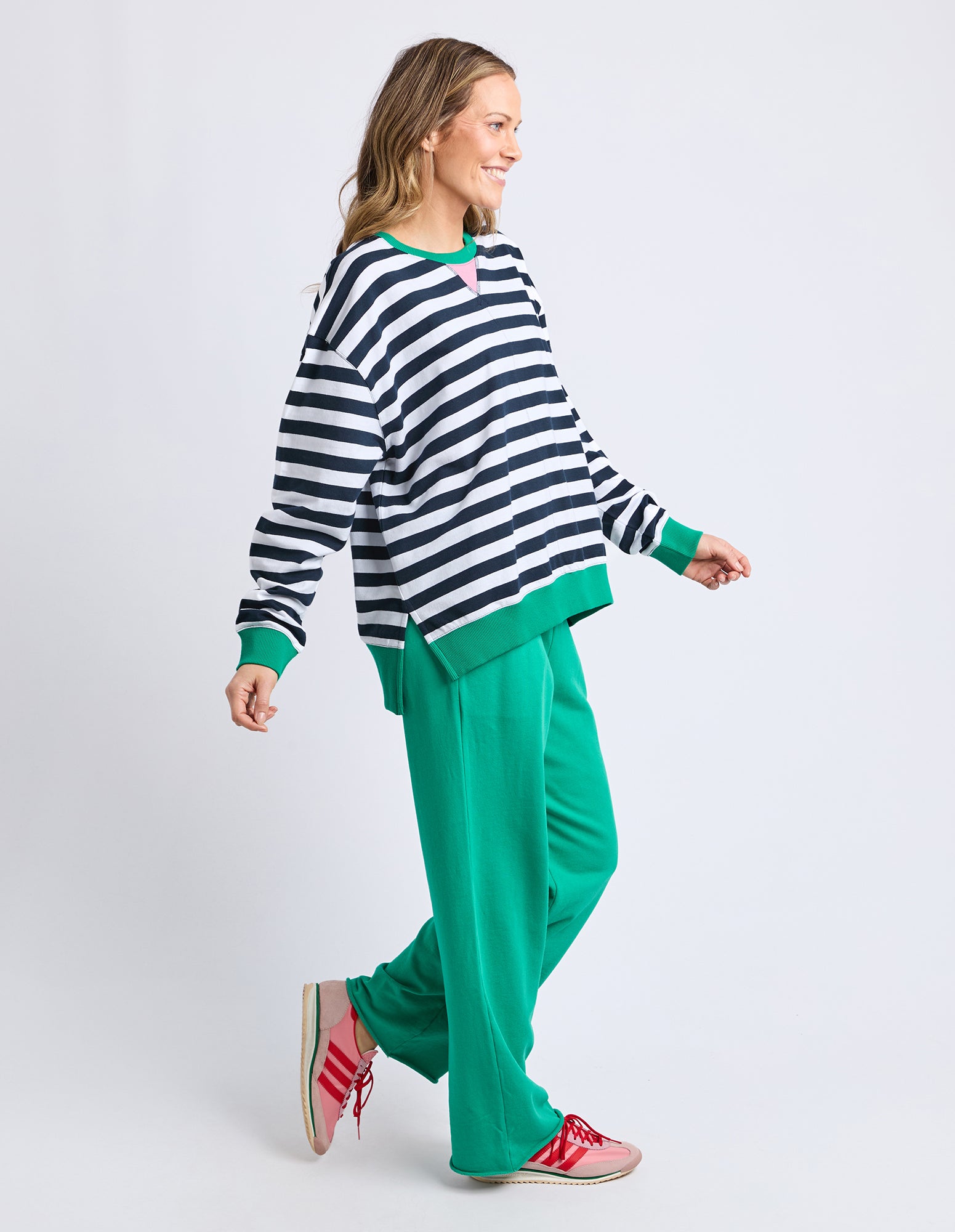 Elevate your everyday wardrobe with this timeless striped crew that effortlessly blends classic style with modern edge. The navy and white stripe pattern offers versatile appeal, while strategically placed side splits provide comfortable movement and a flattering silhouette. Finished with striking contrast green bands that add a pop of personality, this piece transitions seamlessly from casual outings to relaxed social gatherings. A wardrobe essential that proves timeless design never goes out of style