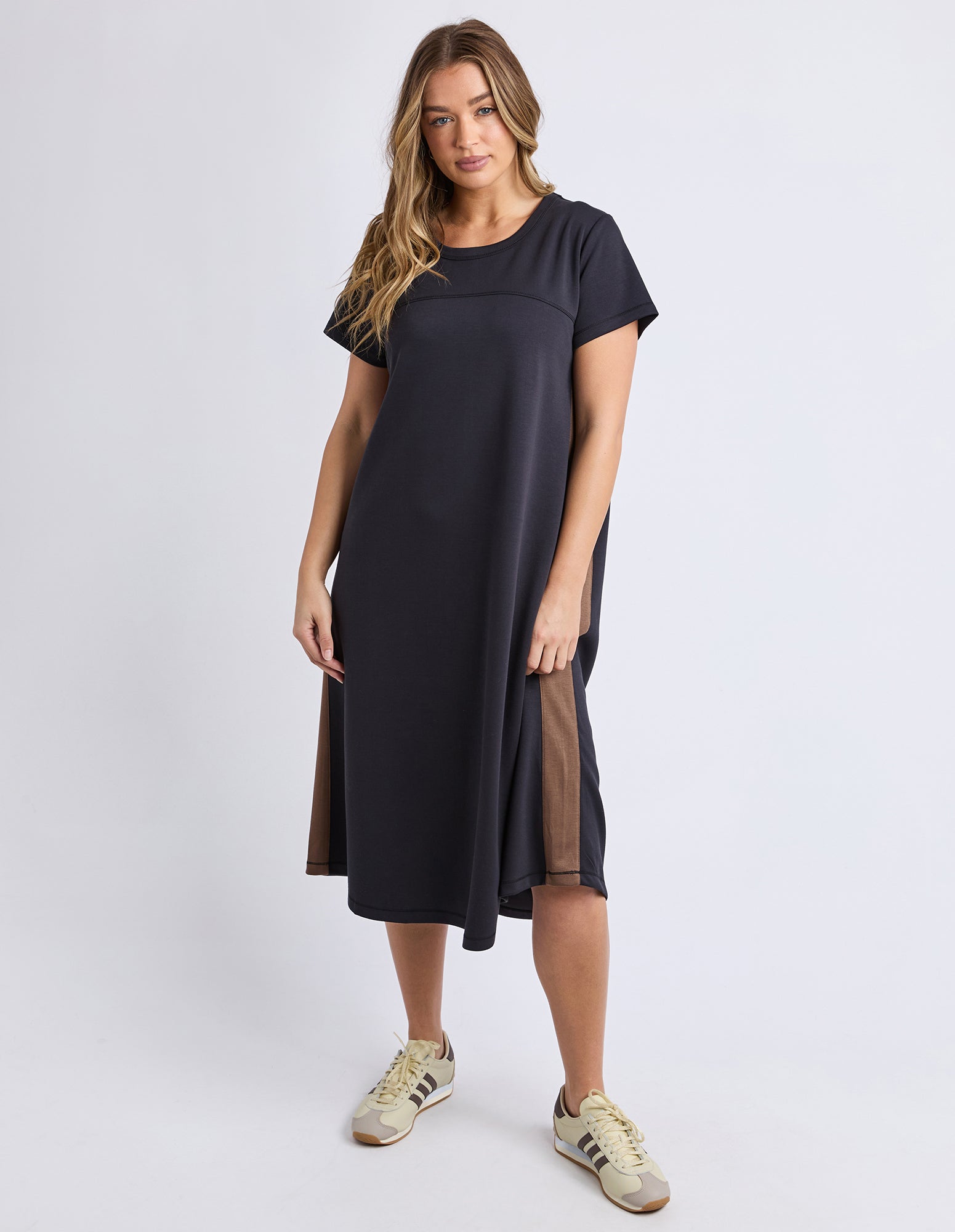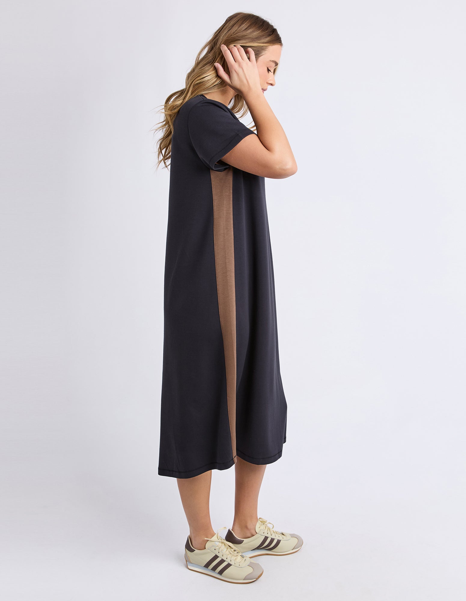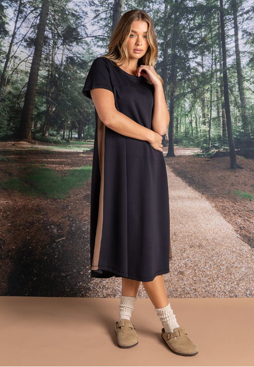 The Seattle Dress combines timeless elegance with contemporary styling. This crew neck design features short sleeves for versatile layering, while distinctive brown stripes run down the sides to create a flattering silhouette. A wardrobe essential that transitions seamlessly from day to evening