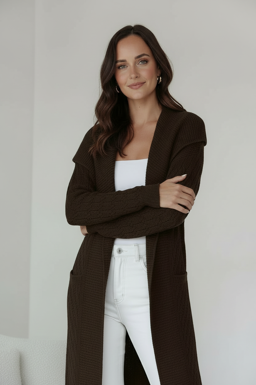 This stylish coatigan features a shawl collar and cable pockets, perfect for adding a touch of sophistication to any outfit