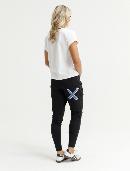 Our popular Apartment Pant in full length - these ones feature a marine blue shadow X on the back. Made from Cotton/Elastane these pants are true to size for a relaxed fit with a drop crotch and they have pockets! - Our model Gracie is 167cm tall, an average size 8 - wearing a size 8. Sizes 6 to 18 available