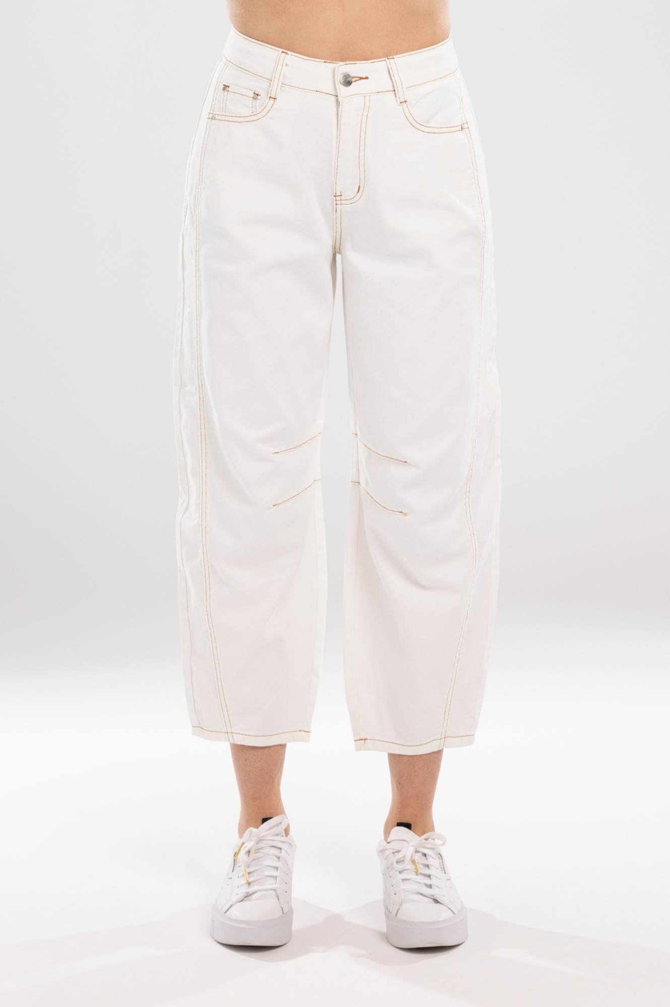 These Barrell Jeans in Ivory feature signature brown topstitching that adds subtle contrast and style. Designed with a convenient zip front and functional pockets, they combine practicality with a flattering silhouette. Perfect for everyday wear, these jeans offer both comfort and a timeless look