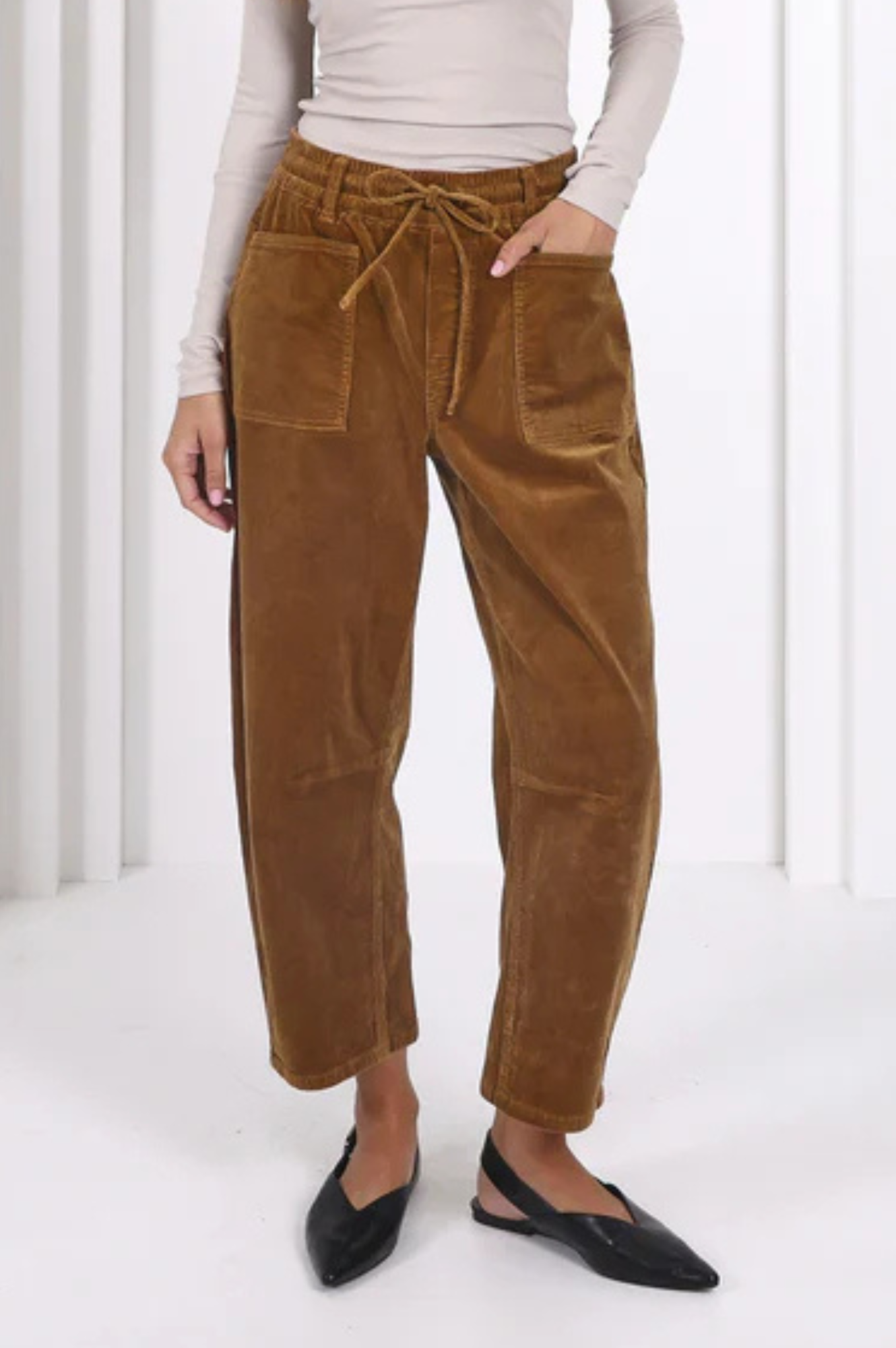 These corduroy barrel jeans combine comfort and style effortlessly. With a soft feel, elastic waistband, and adjustable drawstring, they’re made to move with you. Front flap pockets and back pockets add a functional touch, while the relaxed barrel shape fits and flatters every body. Comfortable, versatile, and perfectly on trend.