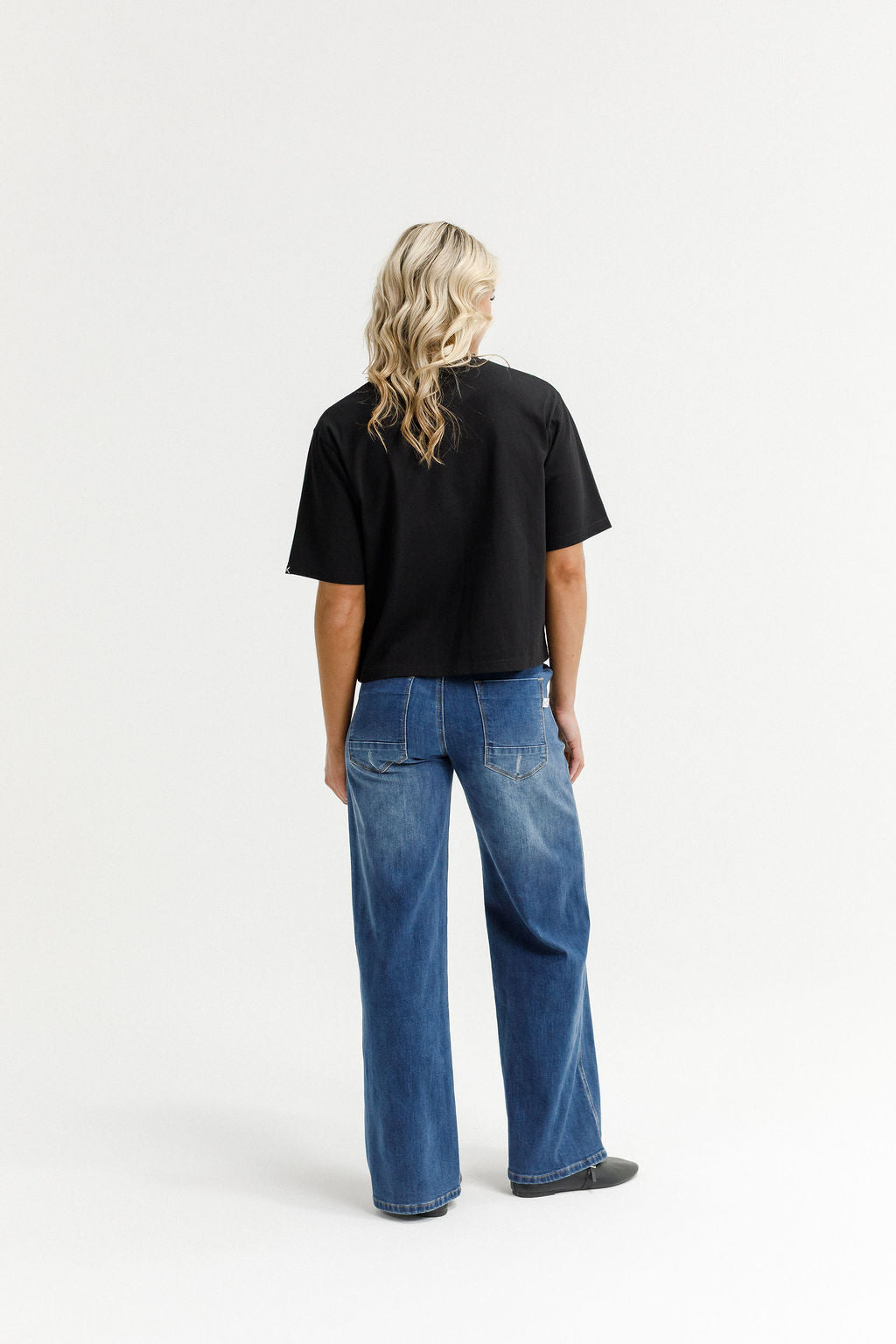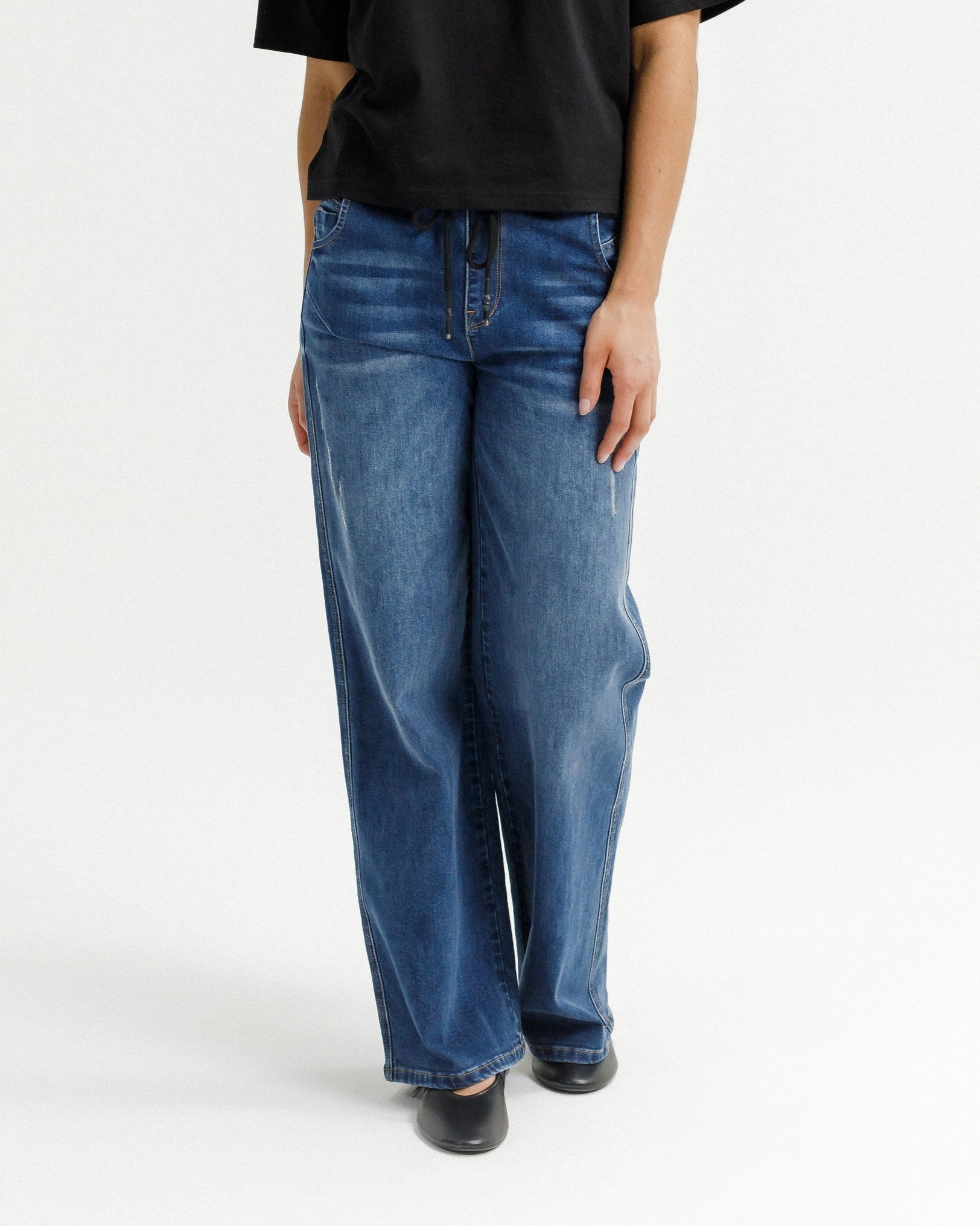 Effortlessly chic and undeniably comfy, these Palazzo Jeans in Blue Wash are your new go-to. The elasticated waist with adjustable tie ensures a custom fit, while the wide-leg silhouette gives you that relaxed, runway-ready vibe. Crafted with elastane for all-day comfort, they move with you—not against you. Plus, practical side pockets mean your essentials have a home