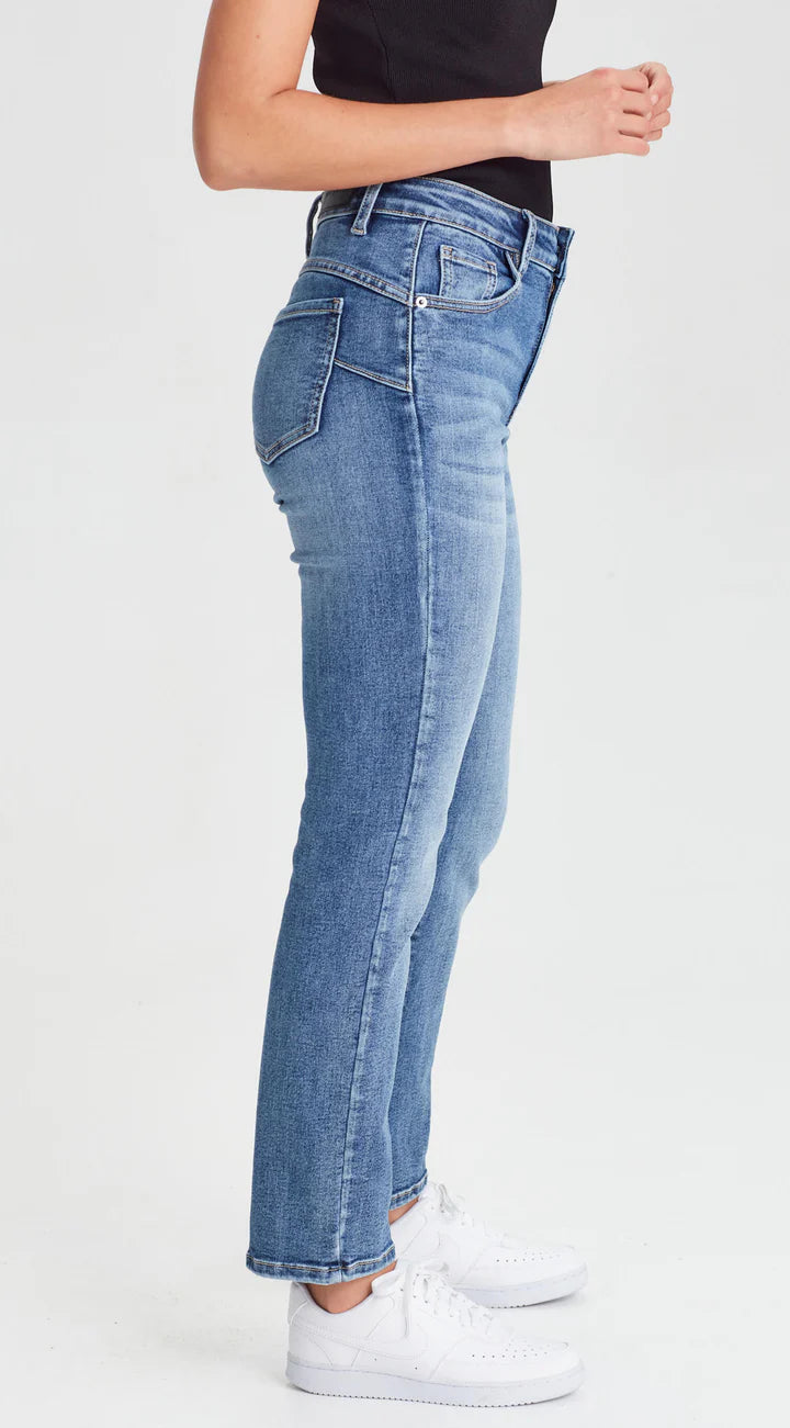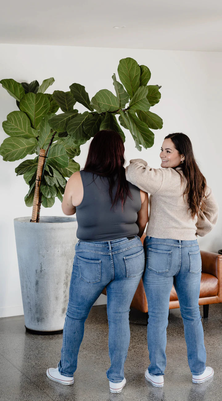 A flattering straight leg jean in a premium soft stretch denim, with a slimmer fit through the waist and thighs and a classic tapered, straight lower leg fit. Designed with a genius stitch pattern at the back for a peachy push up look. The ultimate feel good look good jean.