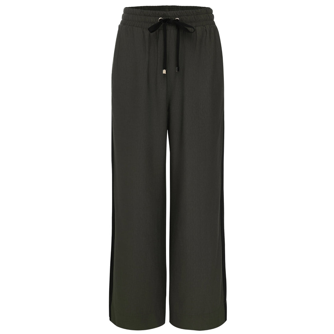 The Indiana wide leg pants are crafted in a lightweight breathable Viscose Nylon fabric and feature 2 side pockets with a new black satin contrast stripes down each leg with a side split at the hem