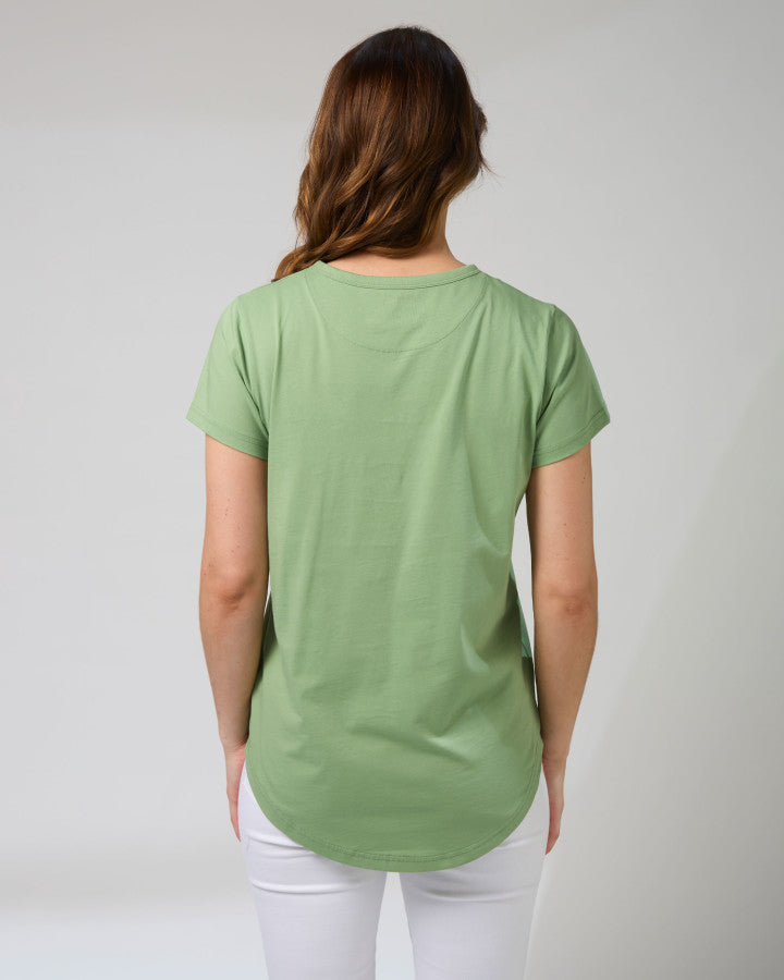 The Classic Tee - timeless Stella and Gemma styling with a standout twist. Its vintage green colour offers a flattering fit, while the front features an elegant white and blue fan. This tee effortlessly elevates everyday looks with subtle edge, making it a versatile wardrobe essential you'll reach for again and again