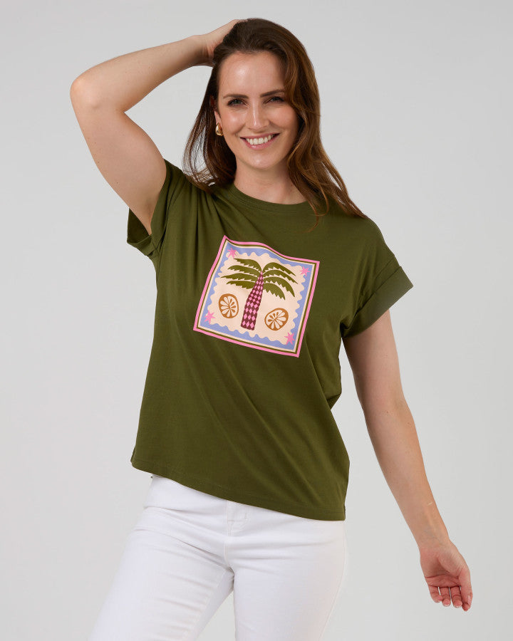 Experience effortless style with the Cuff Tee Palm in Khaki. Its relaxed fit offers all-day comfort, while the eye-catching palm print on the front adds a touch of tropical flair. Perfect for casual outings or laid-back weekends, this tee blends comfort with a fresh, trendy look. Elevate your wardrobe with a versatile piece that pairs easily with your favorite jeans or shorts.