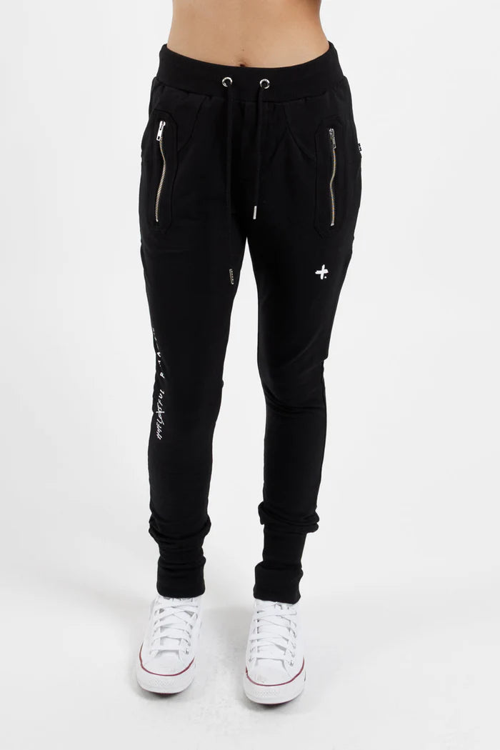 Introducing our much-loved slim-leg trackies in the Hopeful print. The Escape Trackie features silver metal zip detailing upfront and a patch pocket on left leg.