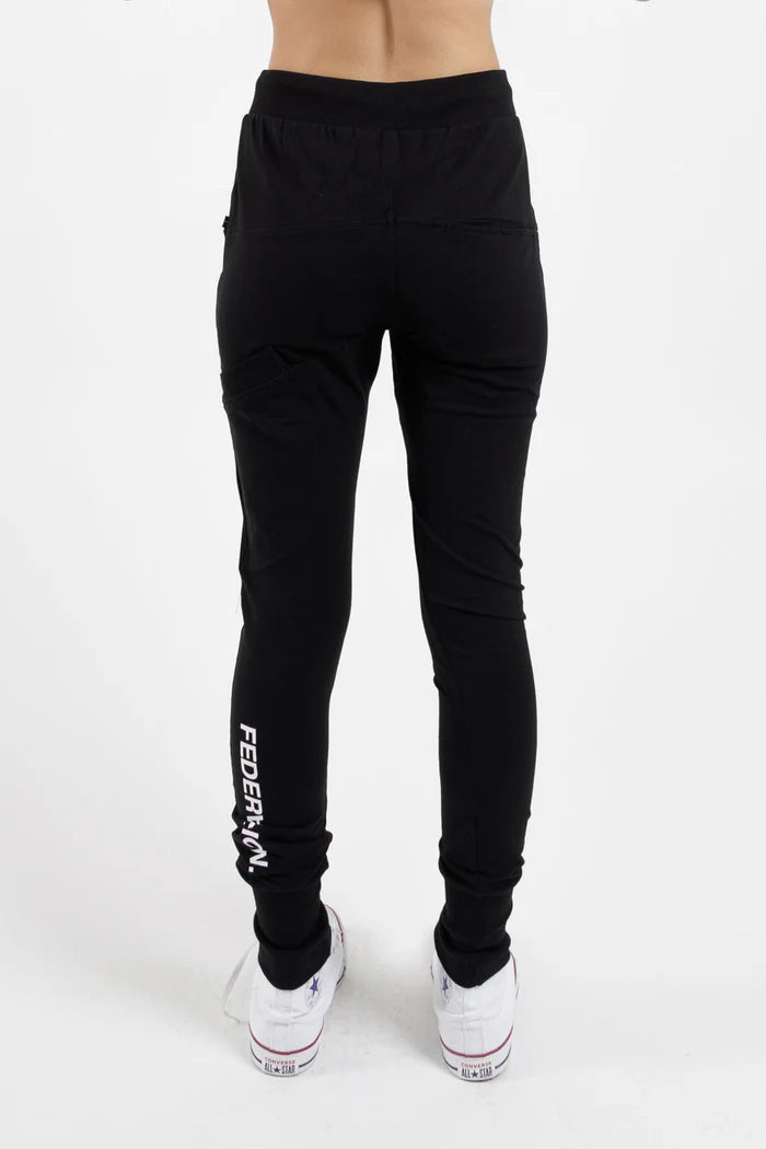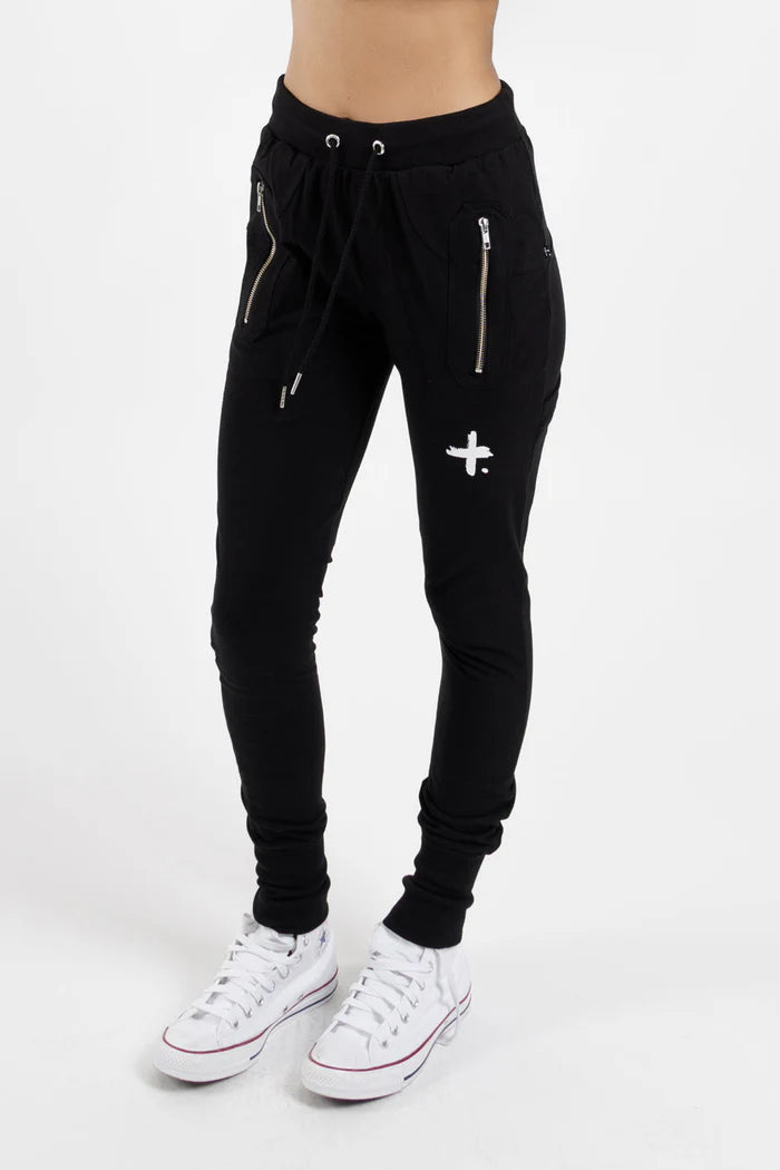 Our much-loved slim-leg trackies are in the new Staple print. The Escape Trackie features Silver metal zip detailing upfront and a patch pocket on the left leg.