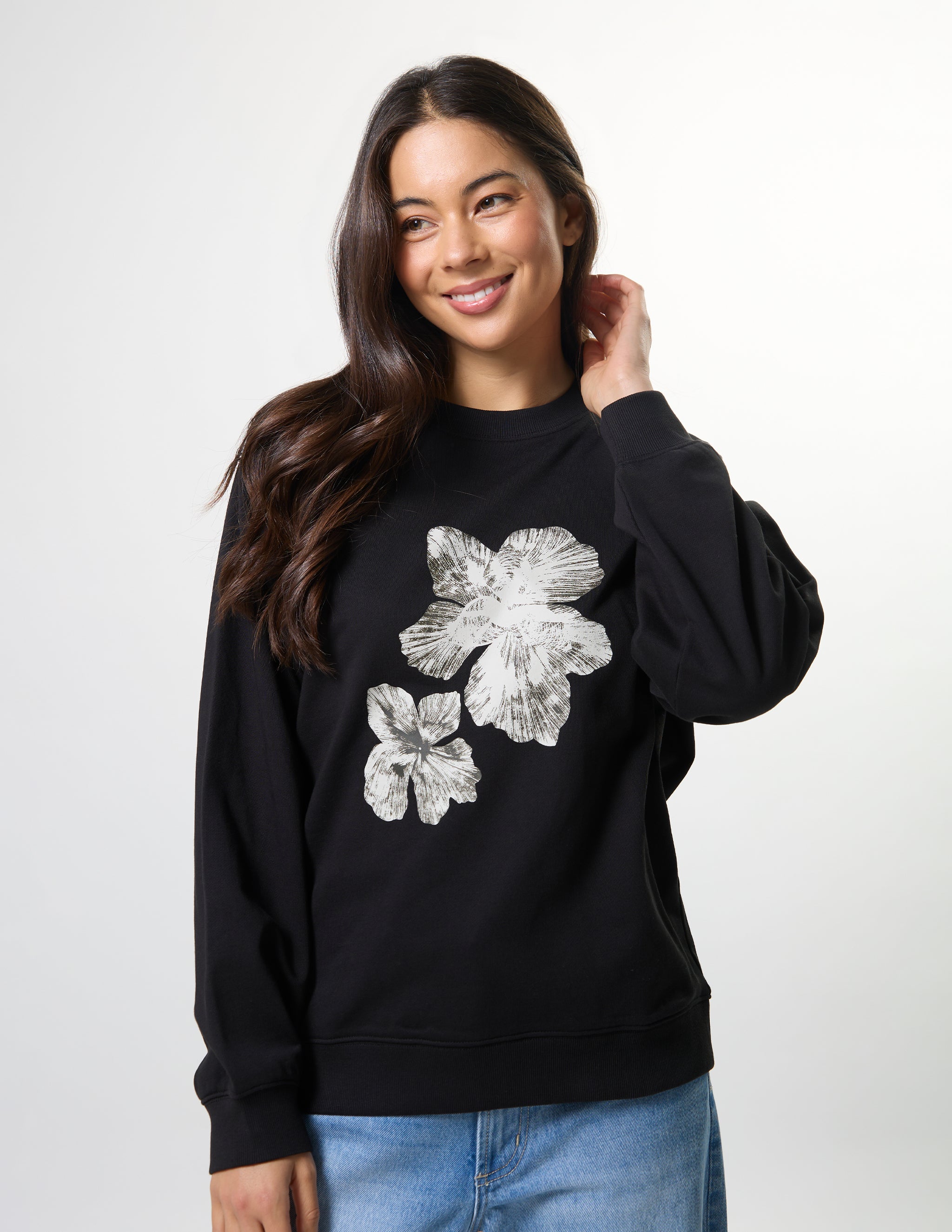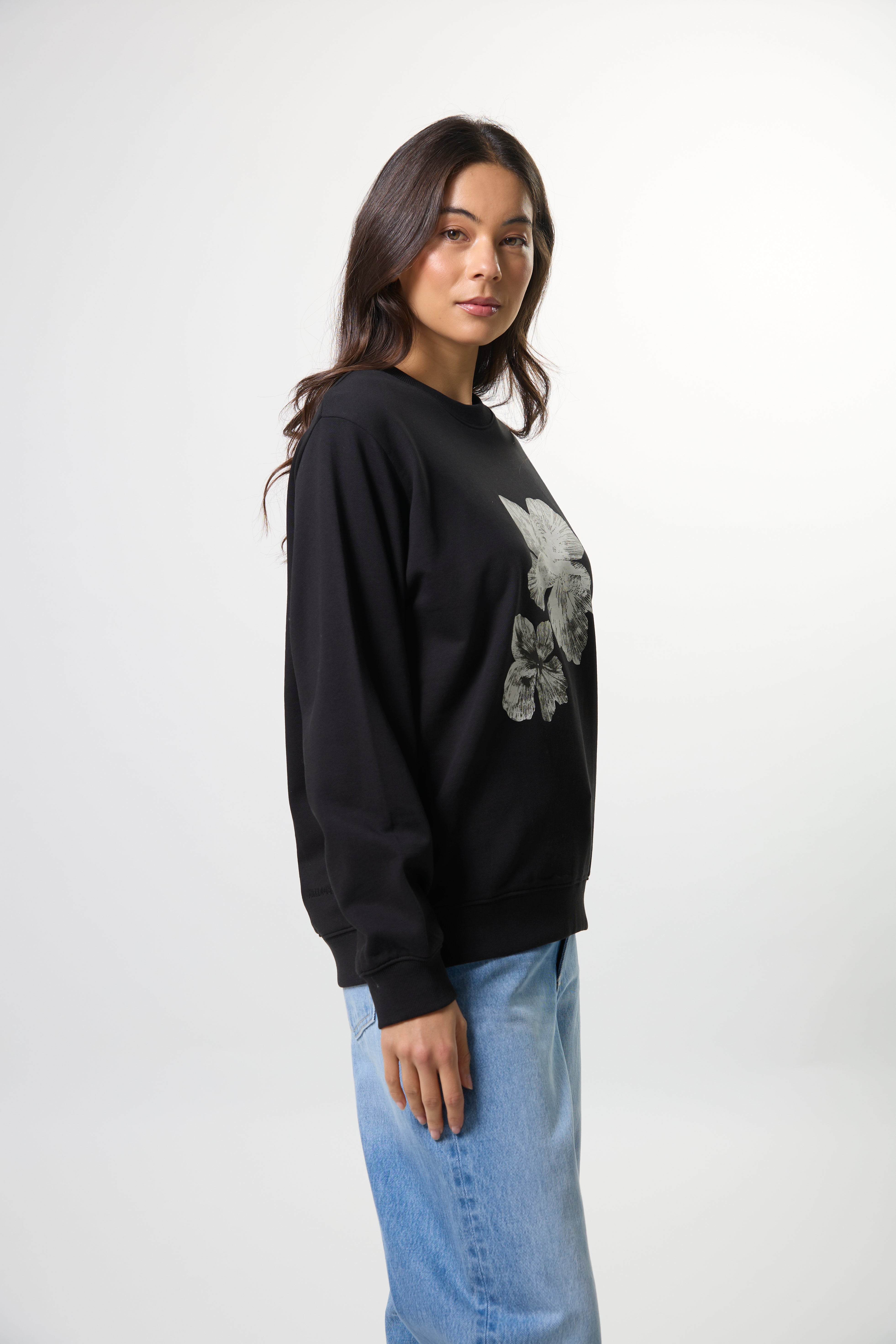 Part of our essentials range, this classic sweatshirt showcases a beautiful cocoa bloom floral pattern on the front. Perfect for everyday wear, it combines comfort with understated style. The timeless design makes it an easy addition to any wardrobe, whether you're dressing it up or keeping it casual.