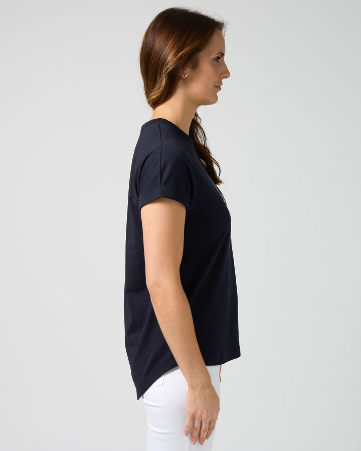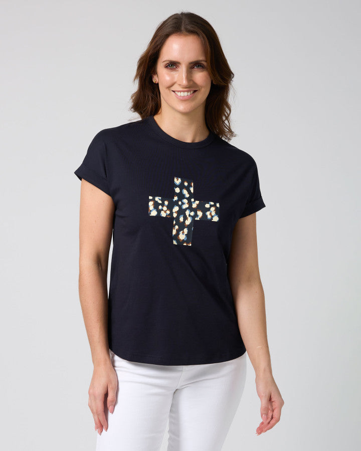 This deep navy Soho Tee features a bold leopard cross design on the front, adding an edgy touch to a classic short sleeve silhouette. Crafted for everyday comfort, it seamlessly blends style and ease, making it the perfect choice to elevate your casual wardrobe