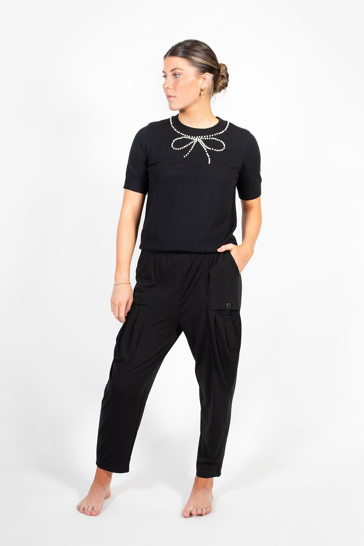 Our classic black pant returns in a new seasonal style, featuring a gorgeous pleat side detailing. Designed for both style and comfort, it boasts a flattering elastic waistband and functional pockets, making it a perfect everyday essential. The cropped leg adds a contemporary edge, making them perfect for pairing with boots or statement flats. A must-have staple ready to take you from day to night with ease