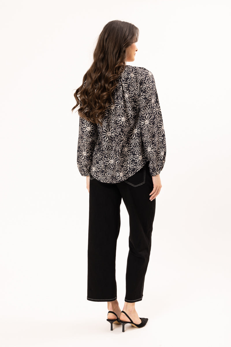 Meet your new go-to top. The United Top in Bold Floral combines striking black and white tones that pair with everything in your closet. Long sleeves offer polished coverage while the curved hem flatters your figure with its modern, flowing cut. From boardroom to brunch, this is the piece you'll reach for again and again—versatile enough for any occasion, confident enough to stand alone.
