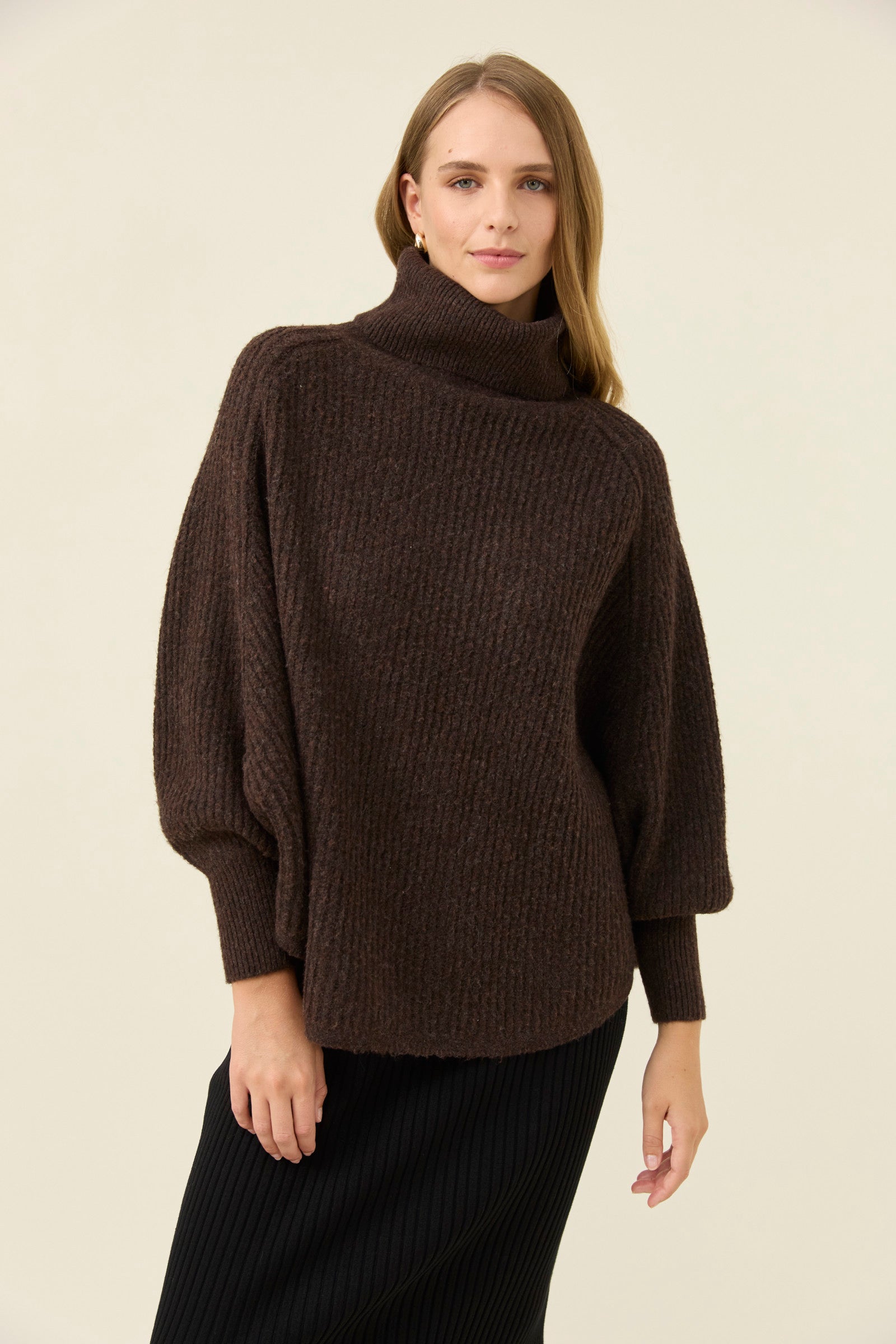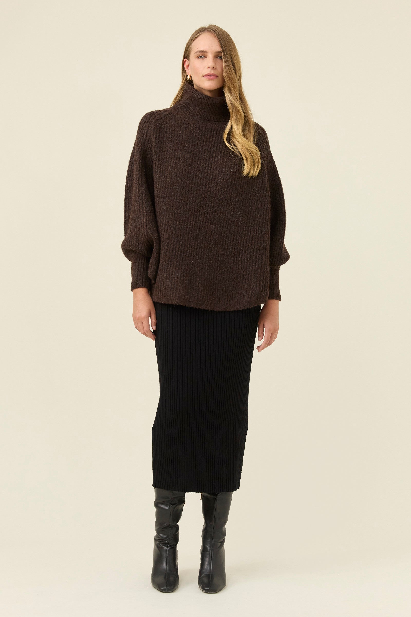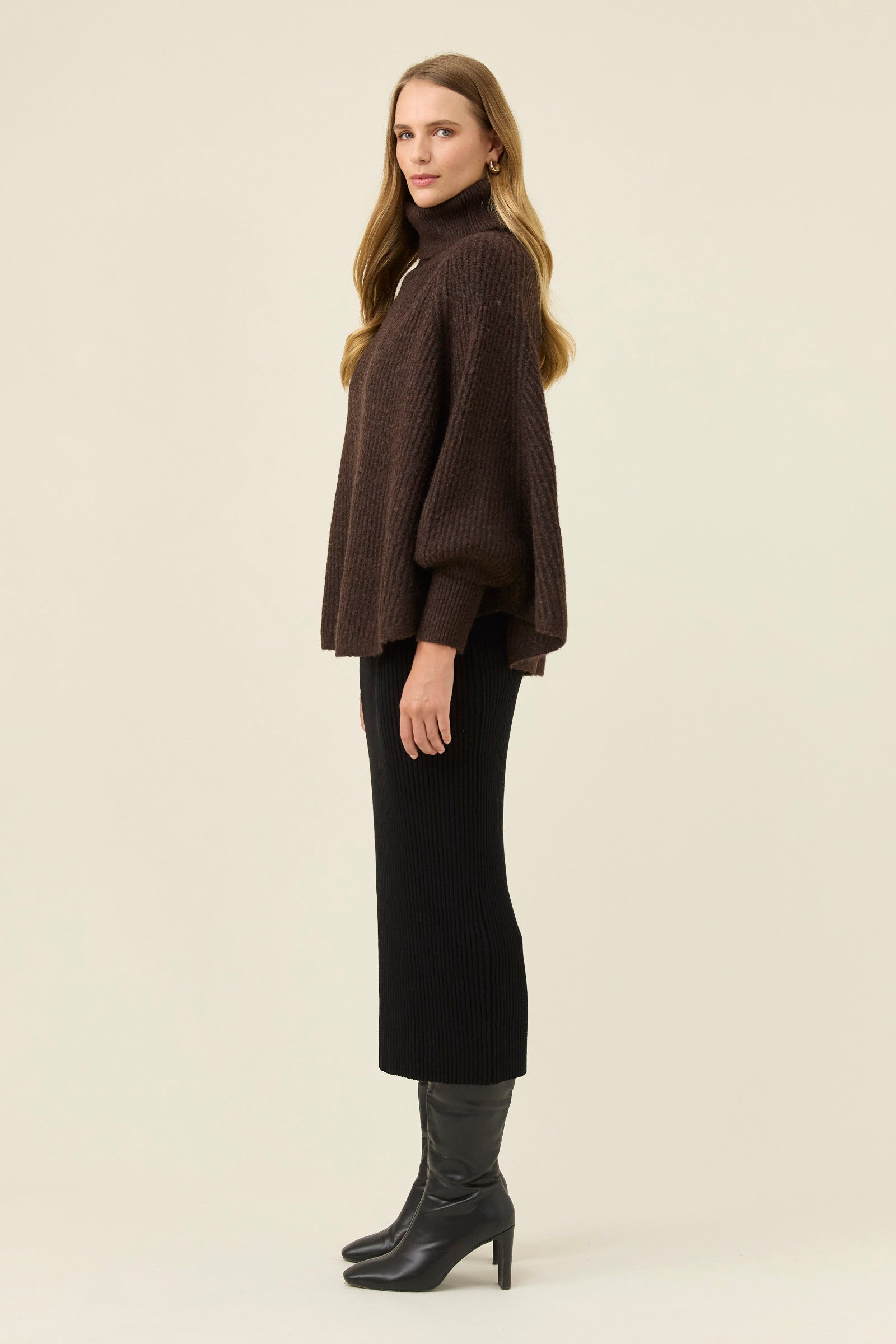 The Miru Poncho in chocolate showcases thoughtful design through its roll neck collar and generous poncho drape, anchored by fitted sleeve cuffs that prevent excess fabric at the wrists. Crafted from ribbed knit, this piece delivers both visual interest and structural integrity. The silhouette works beautifully as a standalone statement or layered over fitted pieces, offering versatility across seasons