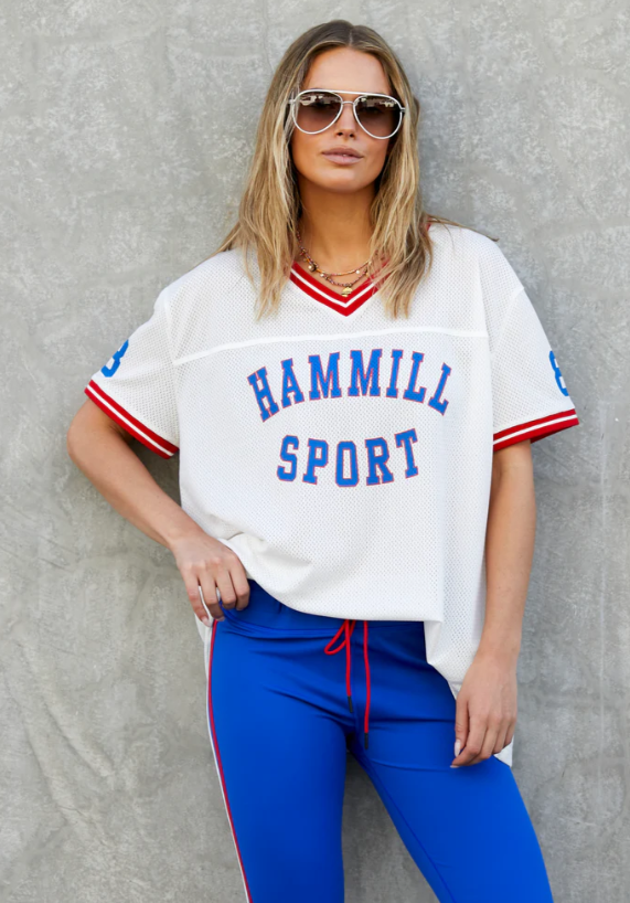 New Hammill Sport mesh tee brings a classic athletic feel, featuring bold collegiate letters and contrast stripe trims that give it that vintage game-day energy. Lightweight, breathable textured mesh with front Hammill Spot and 74 print on the back.