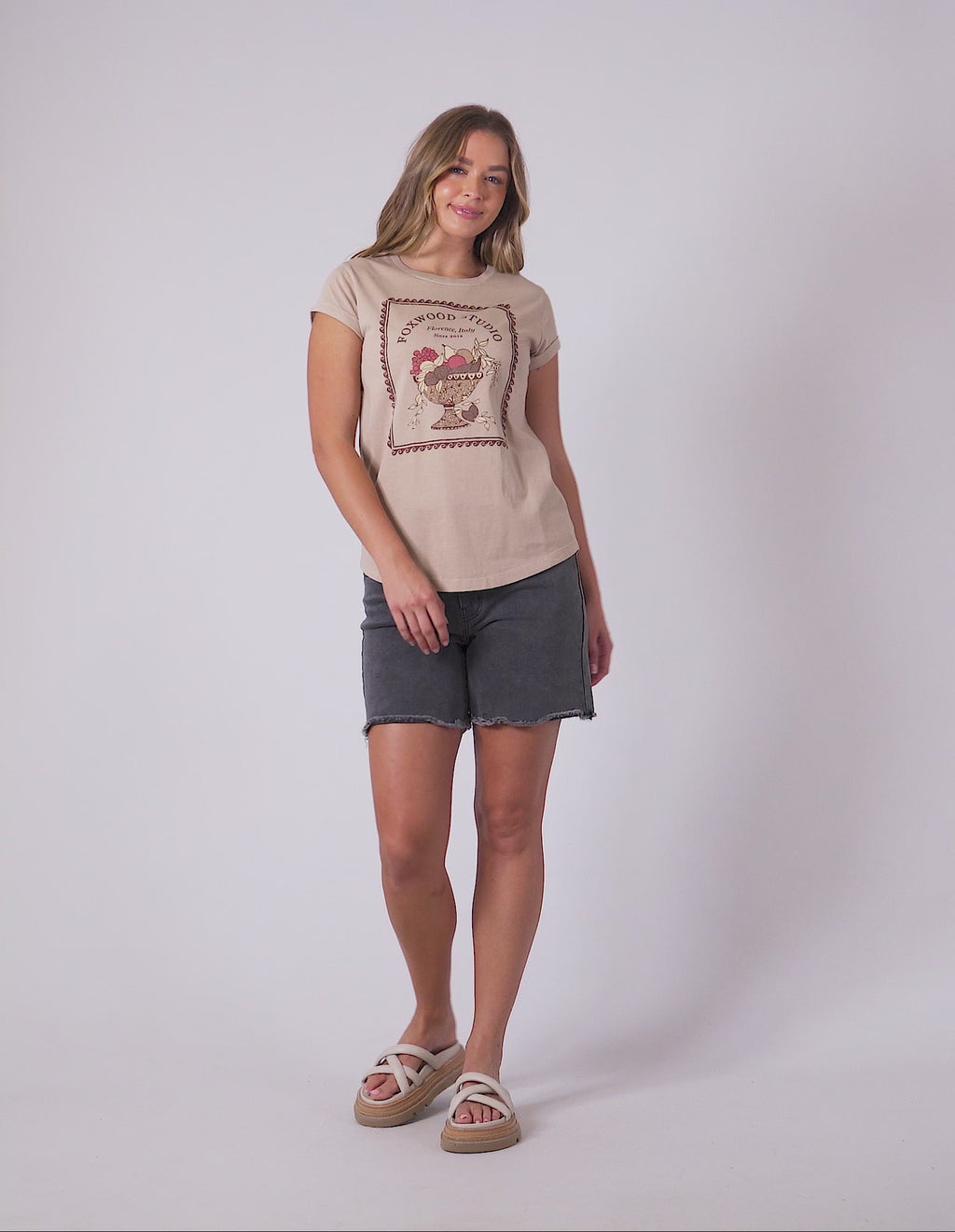 Bring a relaxed sense of style to your everyday look with the Florence Tee. Crafted from soft cotton, this tee offers lasting comfort and a classic feel. The warm neutral colour pairs easily with denim or shorts, while the vintage-style print adds a creative touch. Designed with a cuffed sleeve, curved hem, and round neck, it’s perfect for casual days with a touch of character