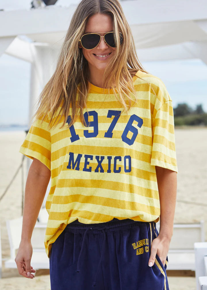 Slouchy crew neck tee in a soft yellow and mustard stripe jersey with navy retro Mexico print on the front. Looks great worn back with the velour pants and shorts!