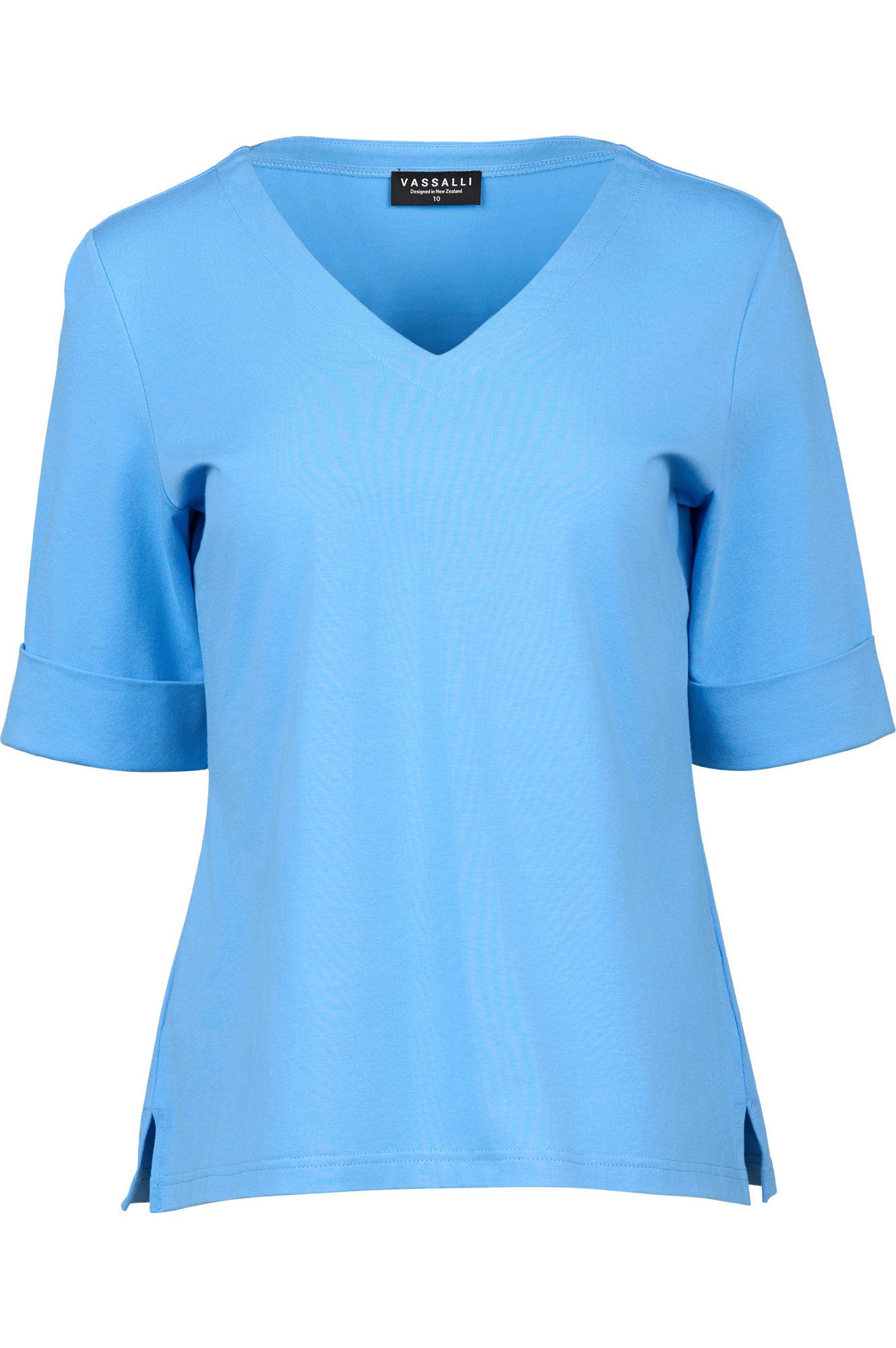 This Vee Neck Top in a serene sky blue features elegant elbow-length sleeves with refined cuff details, offering a polished look perfect for any occasion. Small side splits enhance comfort and movement, making it a versatile addition to your wardrobe that effortlessly combines style and ease