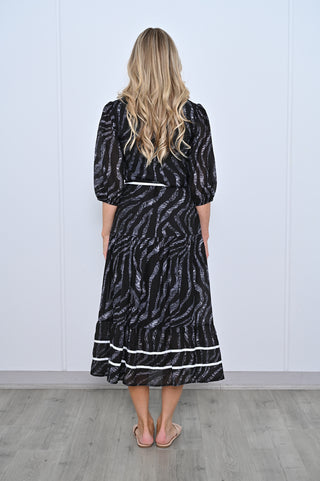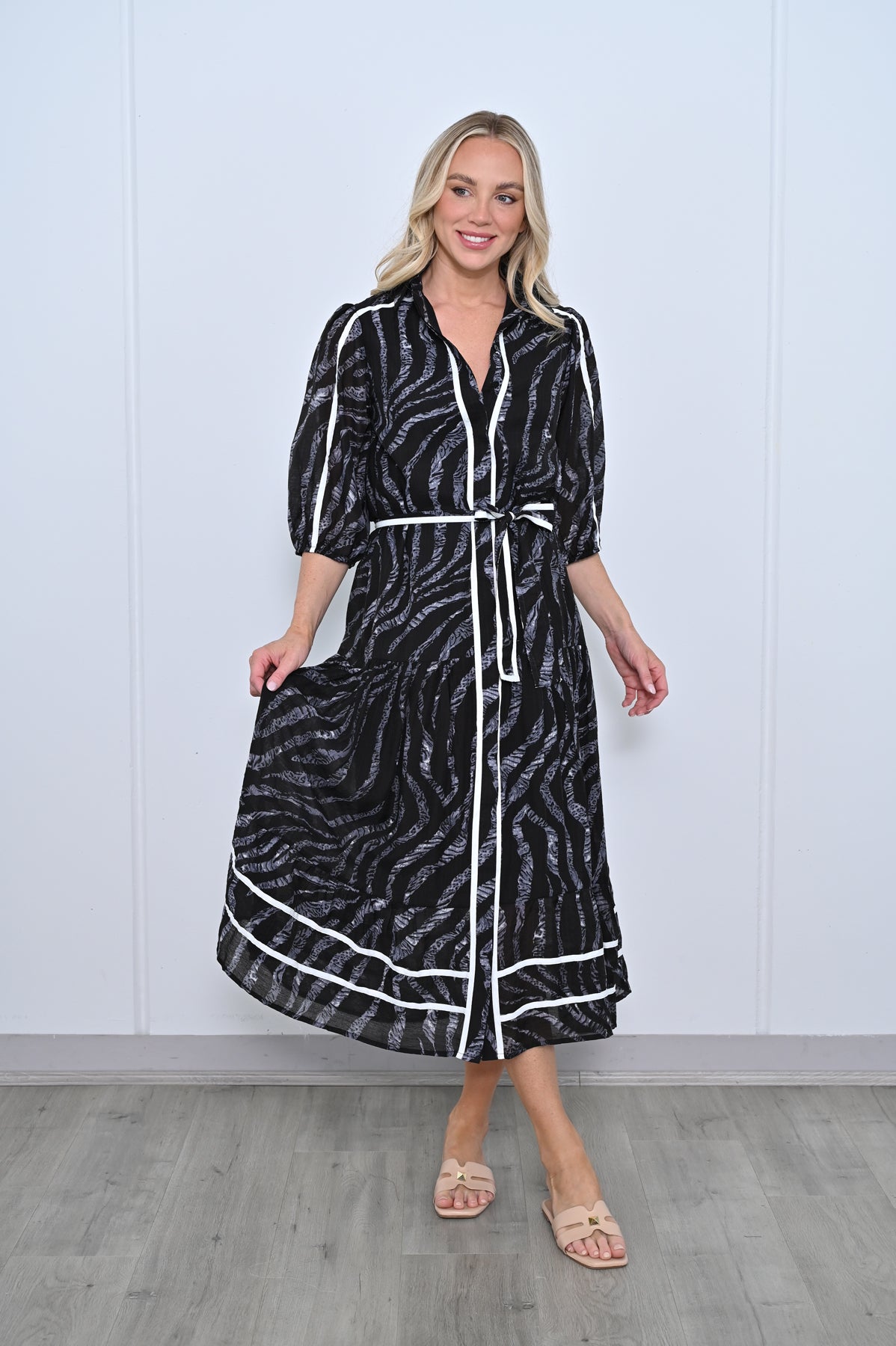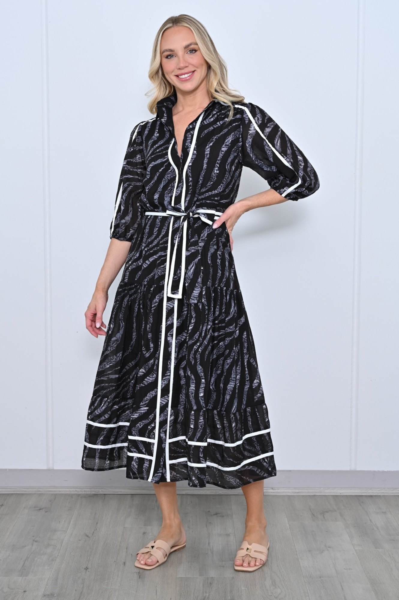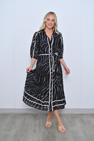 Expertly crafted for a sleek and on trend curate, our 3/4 Sleeve Midi Dress in classic black with white trim is a must-have addition to your wardrobe. The button-through front adds an elegant touch while the 3/4 sleeves provide a flattering silhouette. Perfect for any occasion, this dress is a versatile and timeless choice