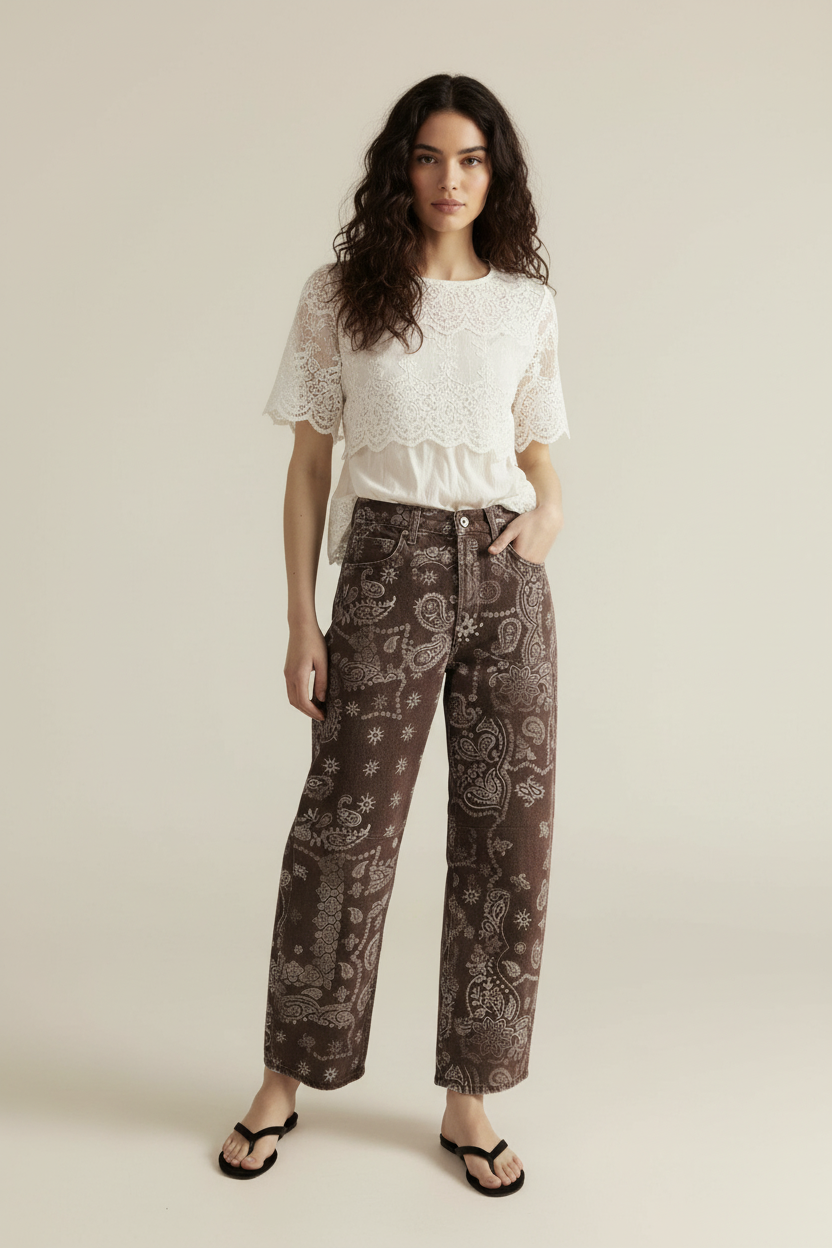 Elevate your denim game with these striking Bandana Barrel Jeans in rich chocolate tones. The eye-catching paisley print adds personality and edge to any outfit, while the flattering barrel silhouette creates a modern, fashion-forward look. Perfect for those who want to stand out without compromising on comfort, these jeans transition seamlessly from casual weekends to styled-up nights out. A versatile wardrobe essential that proves great style doesn't have to be boring.
