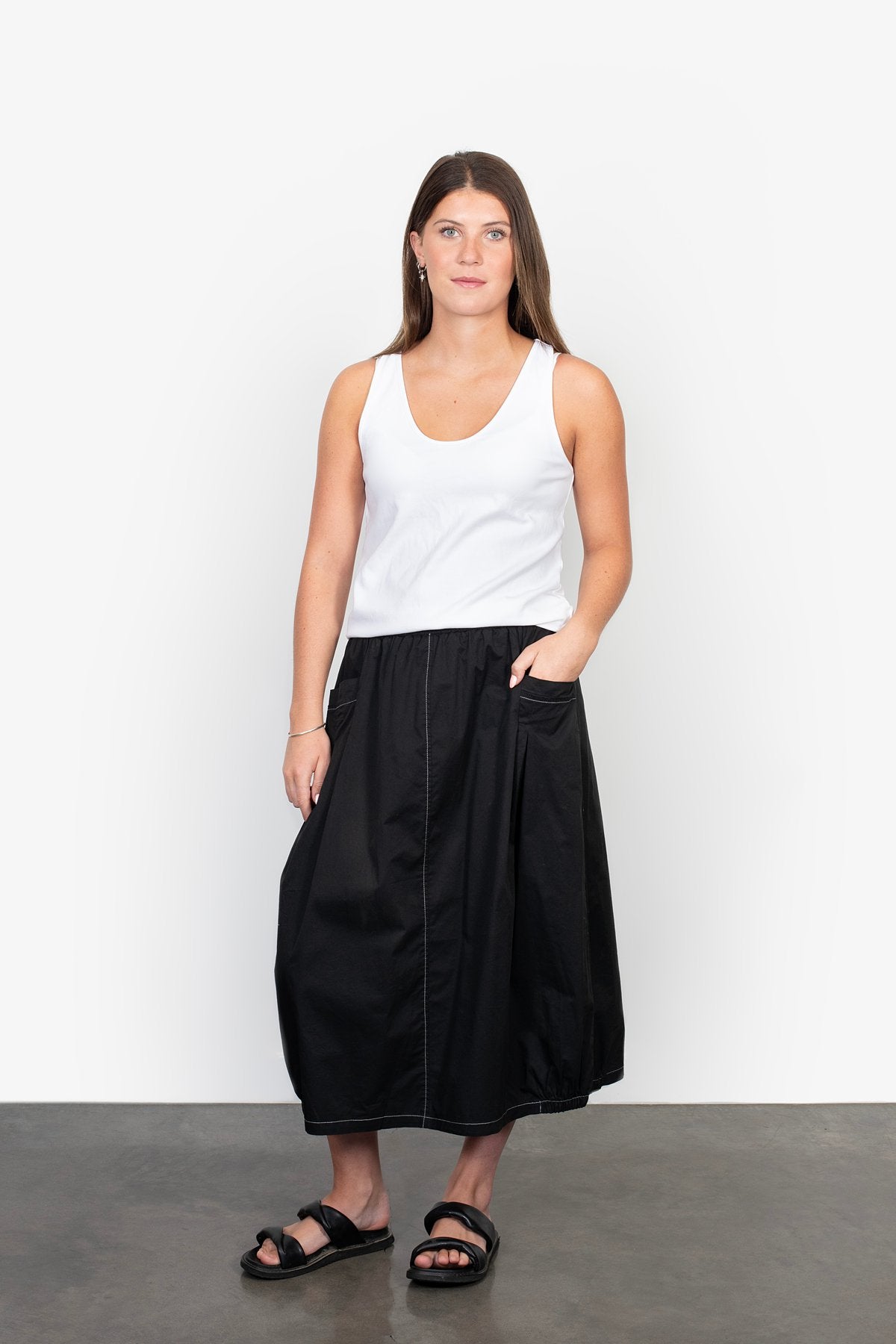 - The Cyrus Skirt in Black with white topstitching is your new go-to for casual wear. Crafted from lightweight, breathable cotton, this skirt features a relaxed A-line silhouette with a subtle balloon hem for added volume and movement.