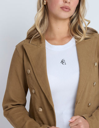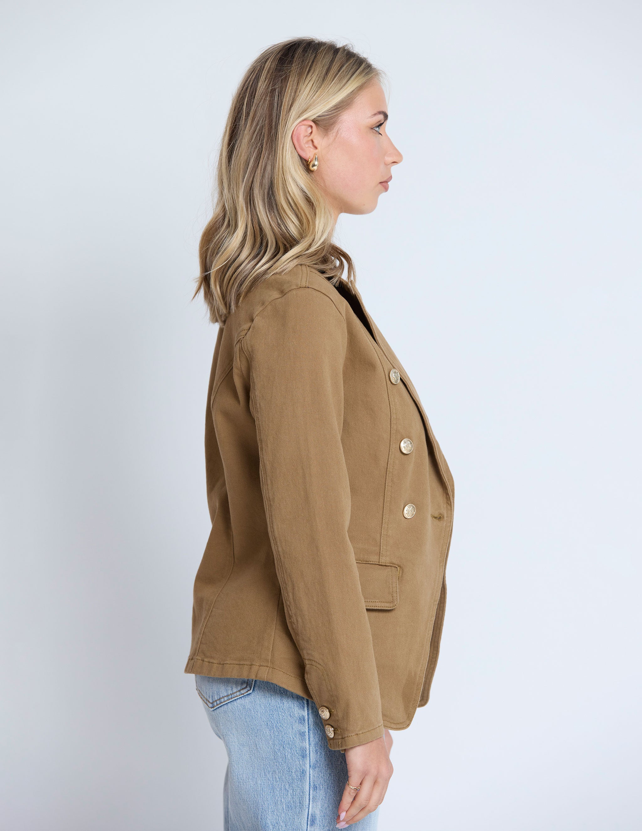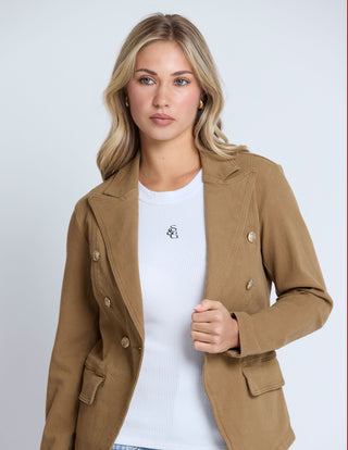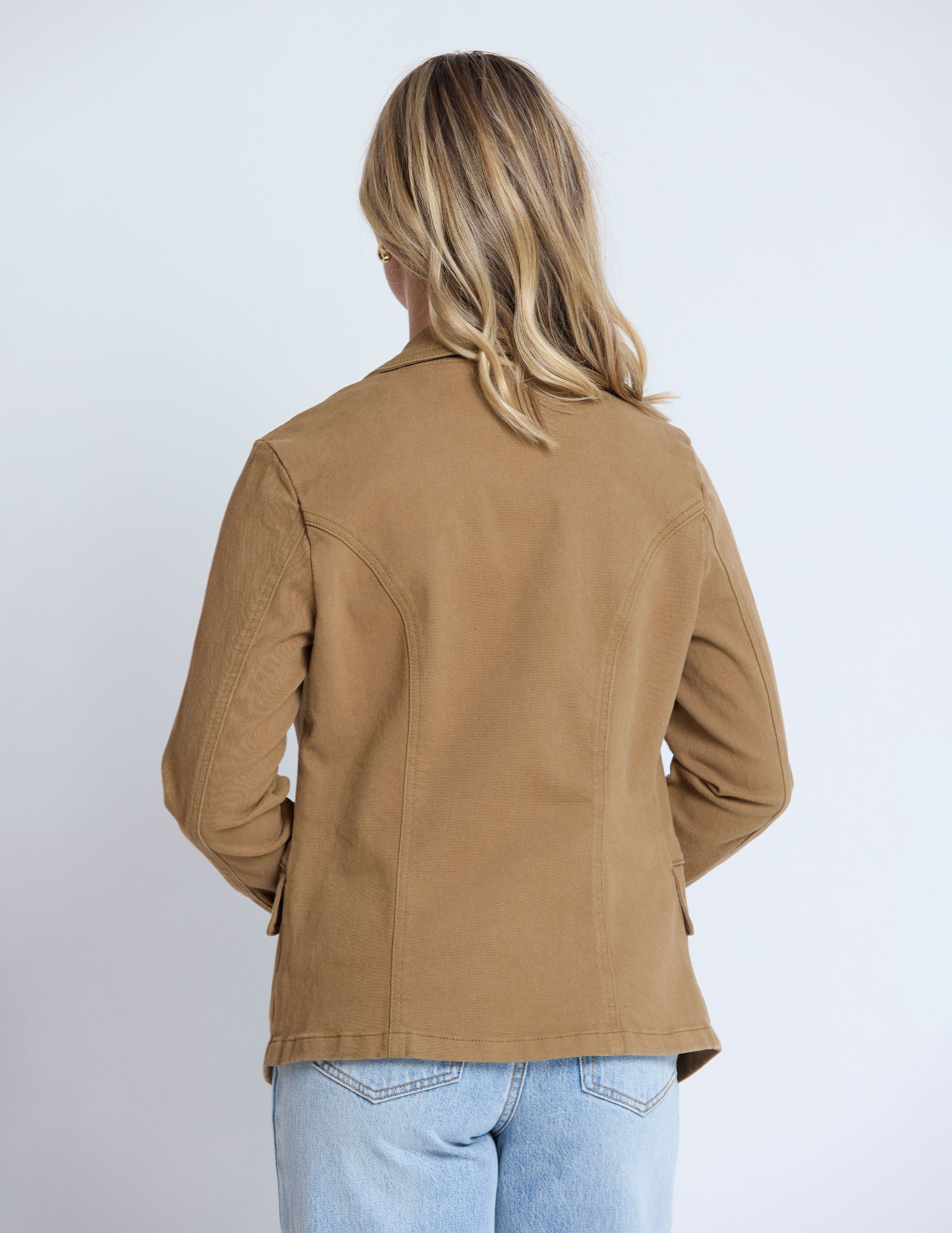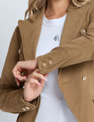 Elevate your wardrobe with the Dayna Jacket in camel. Crafted from stretch denim, this blazer offers a comfortable fit while maintaining a polished look. Featuring a classic collar and lapel, panel detailing, and stylish tack buttons on the cuffs, it effortlessly blends casual and refined elements. Perfect for layering, the Dayna Jacket adds versatile sophistication to any outfit