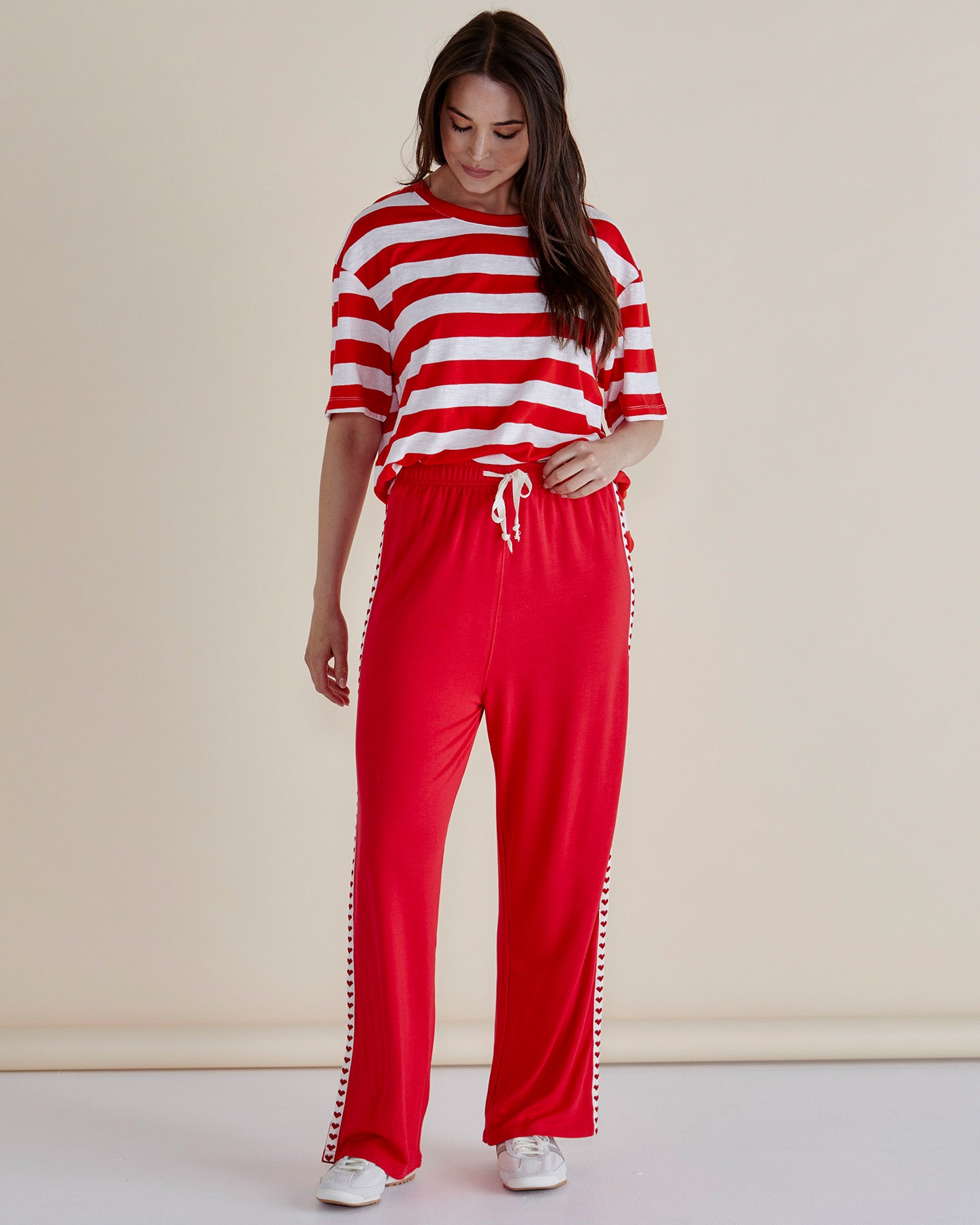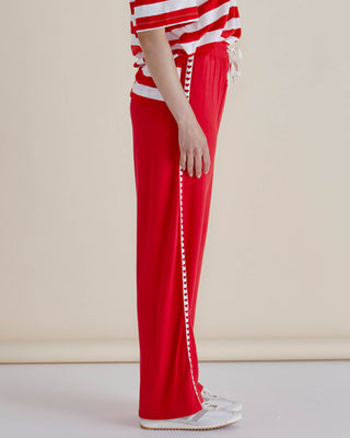 Experience comfort and style with the Evelyn Wide Leg Jogger in Red with Trim. Featuring a relaxed wide-leg fit and sleek stripes down the sides, these joggers offer a modern, sporty look. Convenient side pockets add practicality, making them perfect for everyday wear or casual outings. Elevate your wardrobe with this versatile piece that combines effortless fashion with all-day comfort