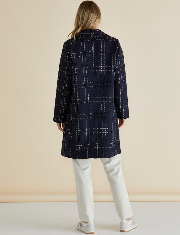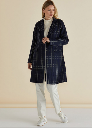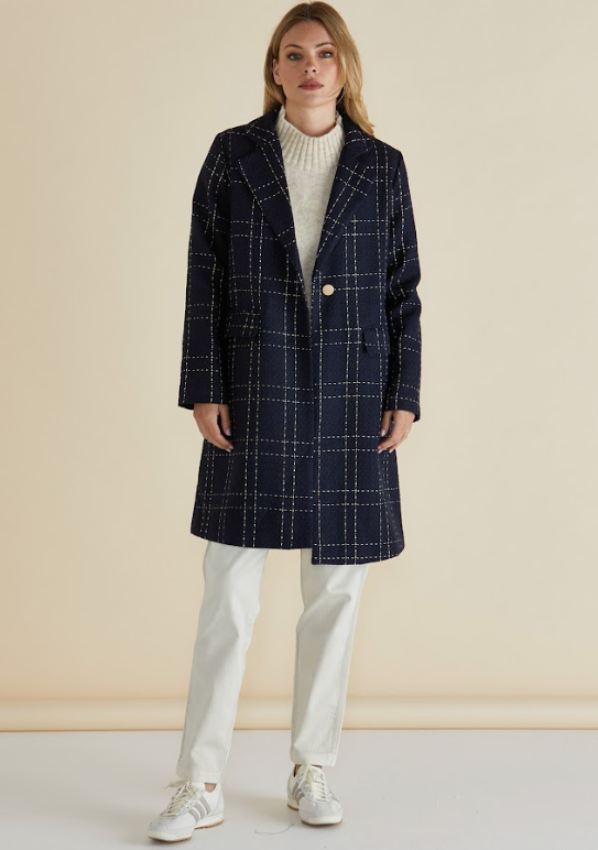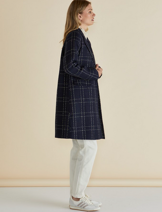 Introducing the Genevieve Coat - Gold/Navy Check. Impeccably crafted with a timeless design, this coat exudes sophistication and charm. Elevate your style with its classic silhouette and luxurious gold/navy check pattern. Perfect for any occasion, this coat is the epitome of elegance