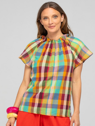 Elevate your wardrobe with the Lilo Top - Isabella, featuring a vibrant multi-coloured check pattern that adds a playful touch to any outfit. Designed with comfortable raglan sleeves and flattering short sleeves, this top also includes delicate neck pleats for a refined finish. Perfect for effortless style and all-day comfort, it’s a versatile piece that brightens your look with ease