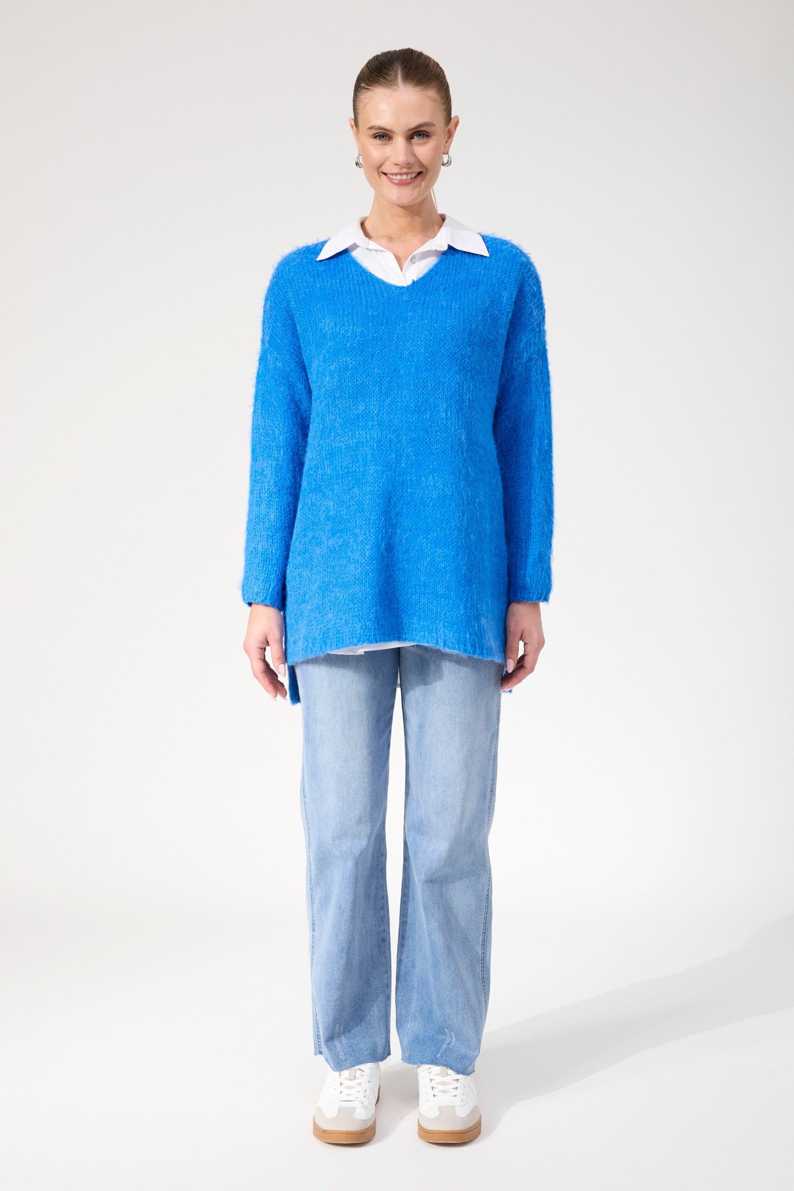 Discover understated sophistication with the Lyon Relaxed Jumper in striking Cobalt. This wardrobe essential combines comfort with contemporary design, featuring a graceful V-neckline and extended sleeves in sumptuous fluffy knit. The distinctive stepped hem paired with strategic side splits delivers an effortlessly polished look that flatters and moves beautifully