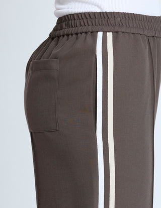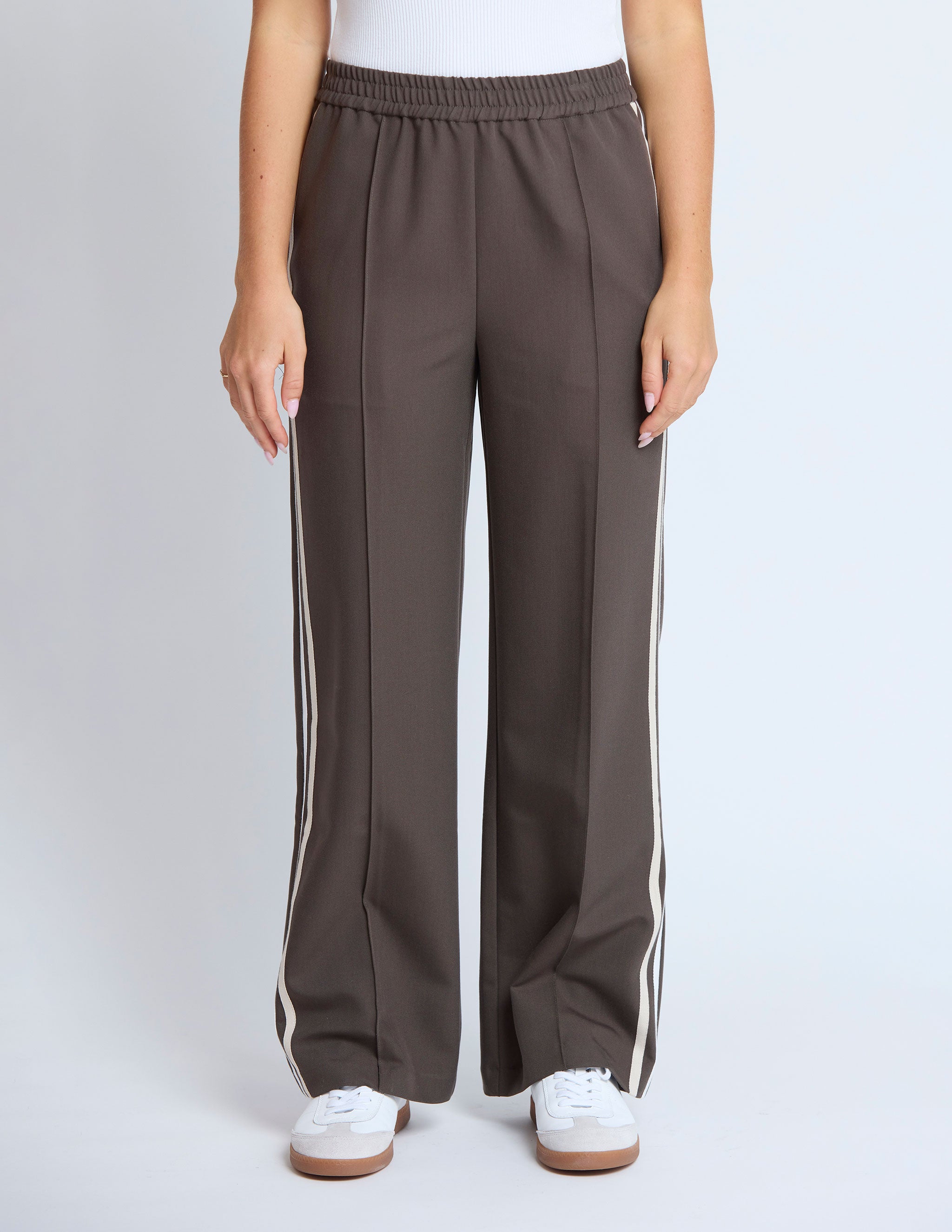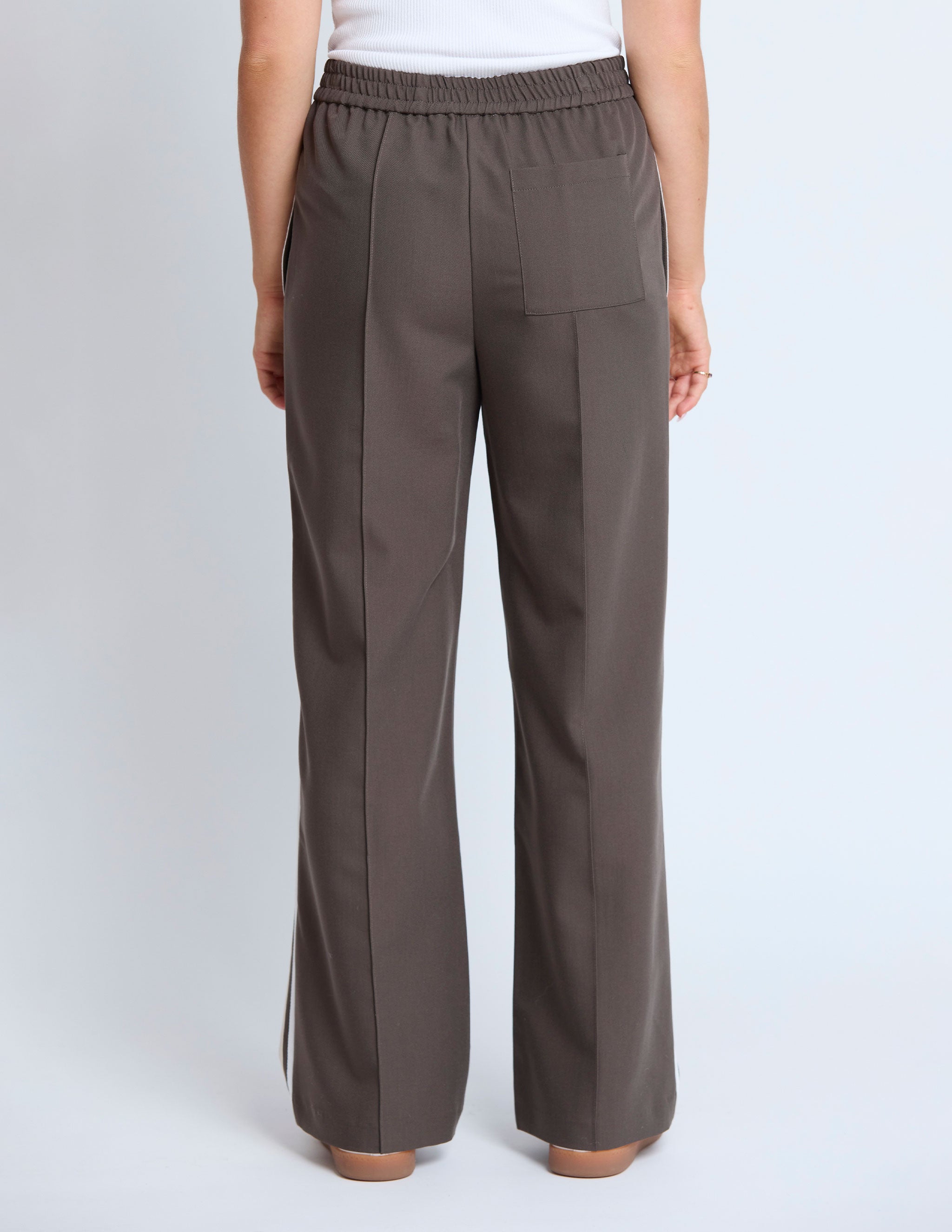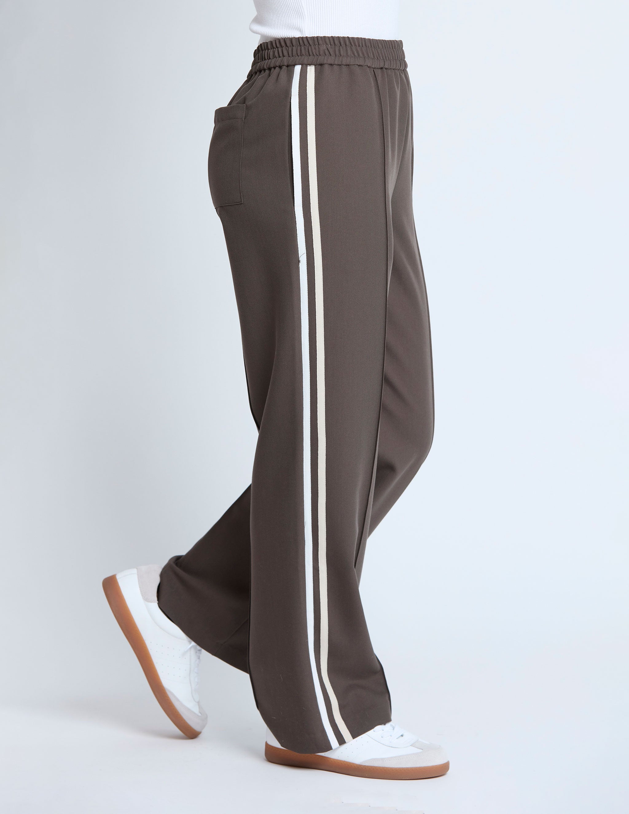These Maggie Pants in khaki offer a relaxed fit with an elasticated waist for all-day comfort. Featuring elegant stripe details down the side of the legs, they add subtle sophistication to your look. Contrast waist ties create a stylish edge, making these pants perfect for both casual outings and polished occasions. Elevate your wardrobe with versatile comfort and standout design