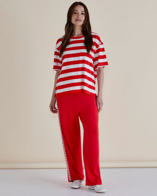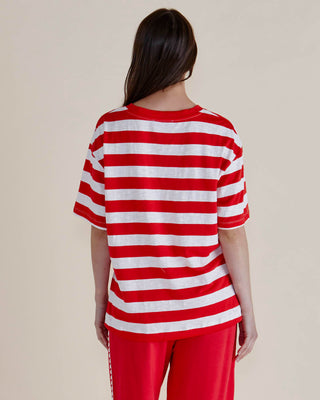 This Relax Boxy Tee in red and white stripes offers a stylish, comfortable fit with its boxy silhouette and elbow-length sleeves. The high-low hem with subtle side splits adds a modern touch, making it perfect for casual days or layering. Embrace effortless style and comfort in this versatile wardrobe essential