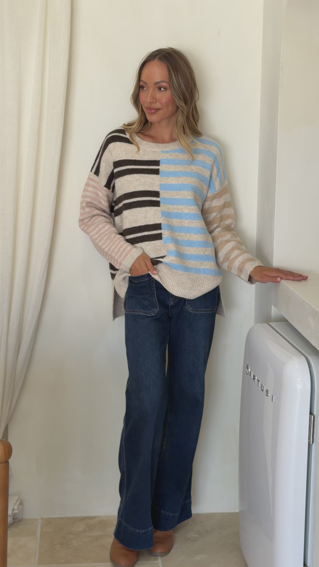 Cozy up in this striped district knit that's equal parts comfort and style. Featuring a playful mix of chocolate, blue, and natural tones throughout, it's the kind of piece that works with everything in your wardrobe. The relaxed dropped shoulder gives you that effortless vibe, while latte-toned hem and cuffs add a polished finishing touch. Perfect for layering or wearing solo—your new go-to knit awaits