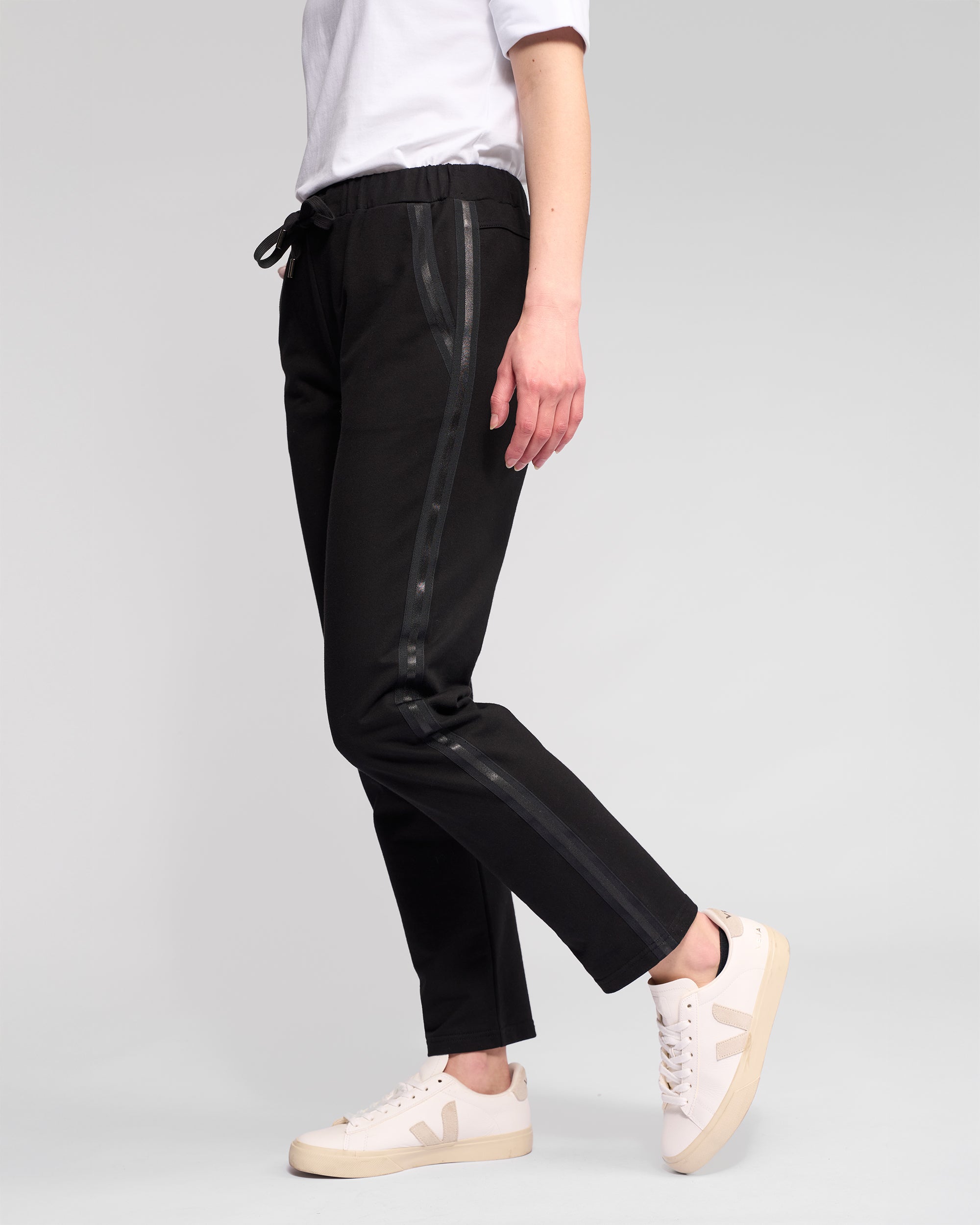 Casual jogger pant in Black, for comfortable everyday wear. Designed with a slim leg and ankle-grazer length, this style features an elasticated waistband with drawstring and glossy black tape detailing along the side seams and around the pockets for a subtle, elevated finish