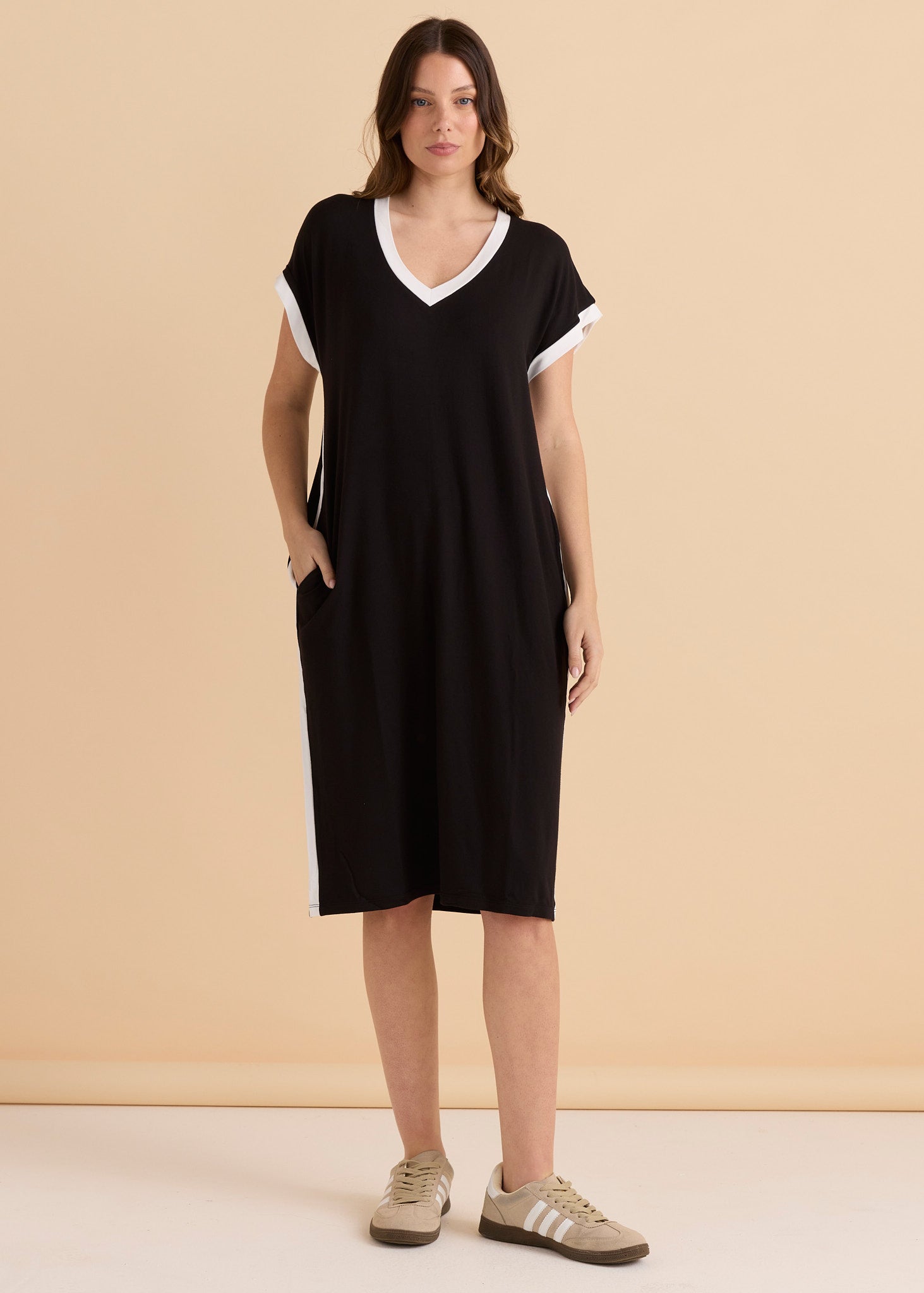 Effortlessly cool and undeniably versatile, the Tula T-Shirt Dress in black and white delivers that laid-back vibe with an edge. The striking contrast trim adds a sporty punch to your everyday look, while practical side pockets keep your essentials within reach. Throw it on with sneakers for casual comfort or dress it up for something more polished.