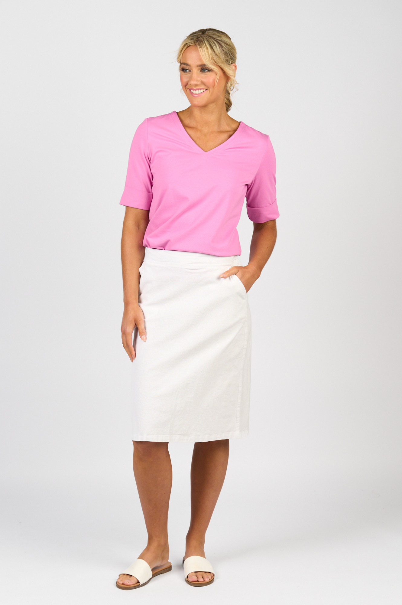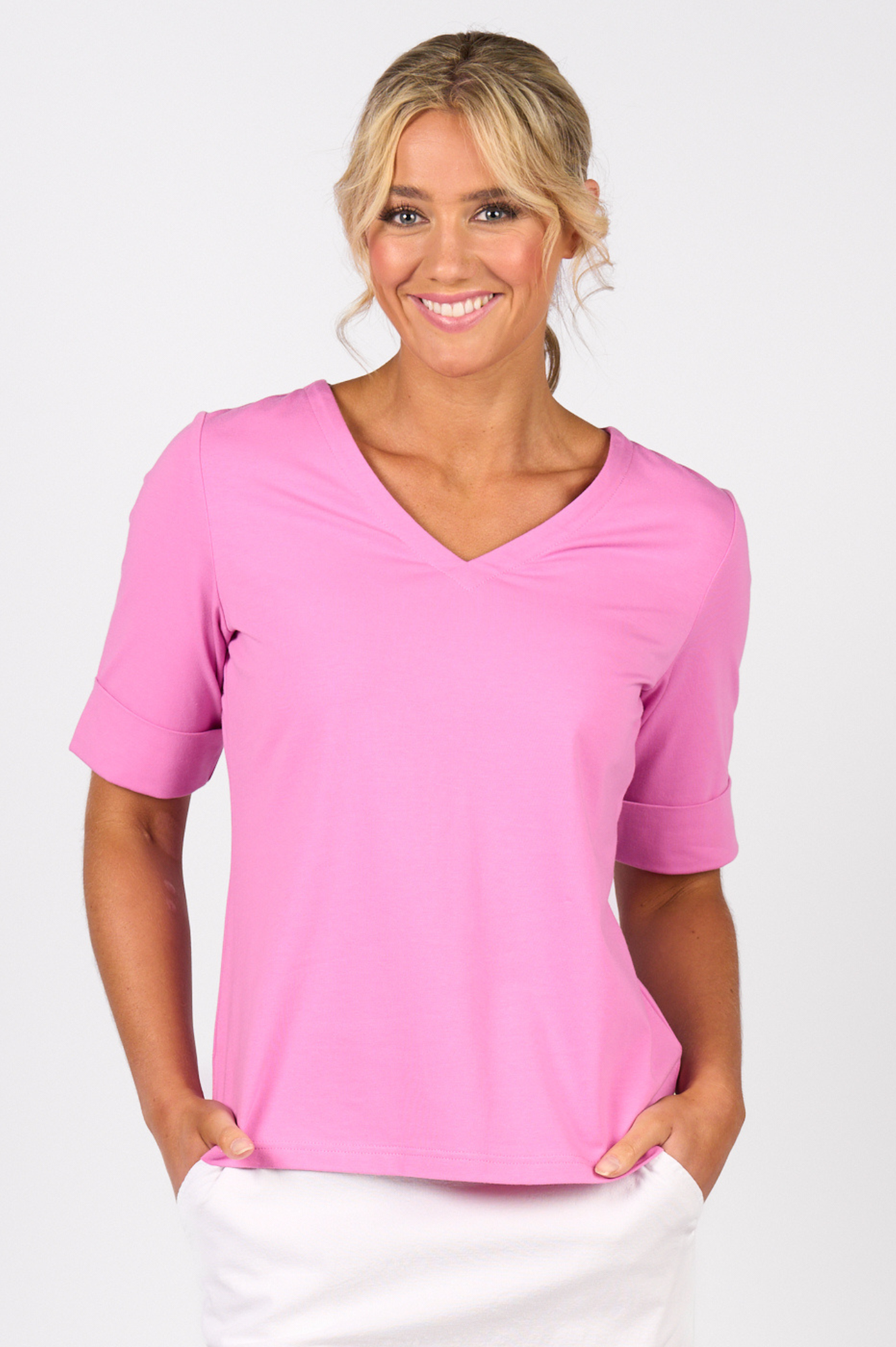This Vee Neck Top in Orchid features elegant elbow-length sleeves with refined cuff details, offering a polished look perfect for any occasion. Small side splits enhance comfort and movement, making it a versatile addition to your wardrobe that effortlessly combines style and ease