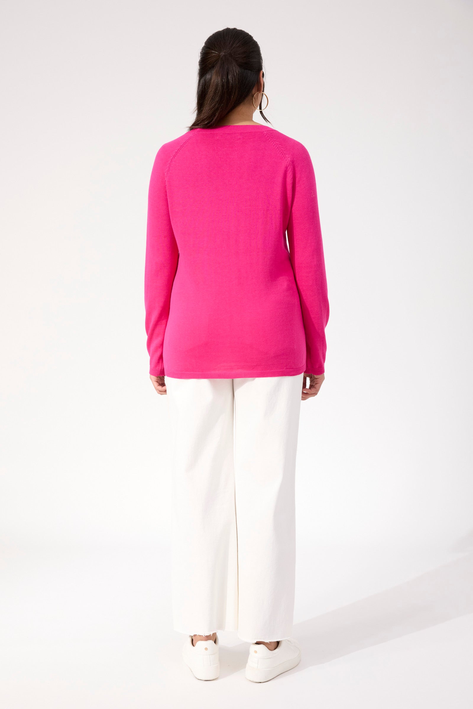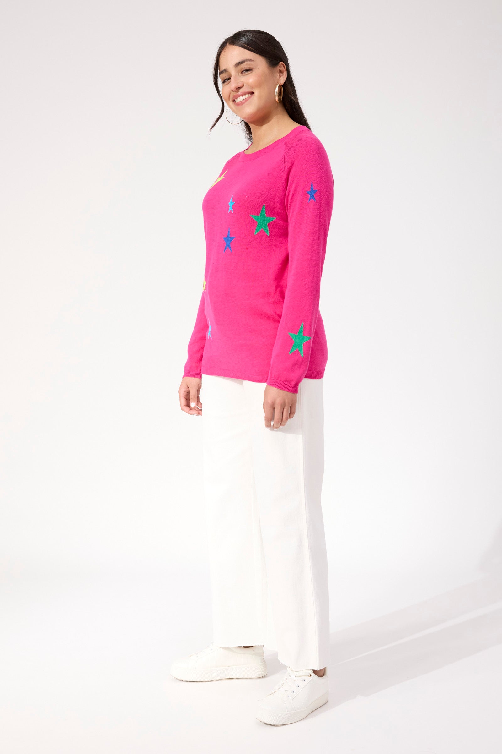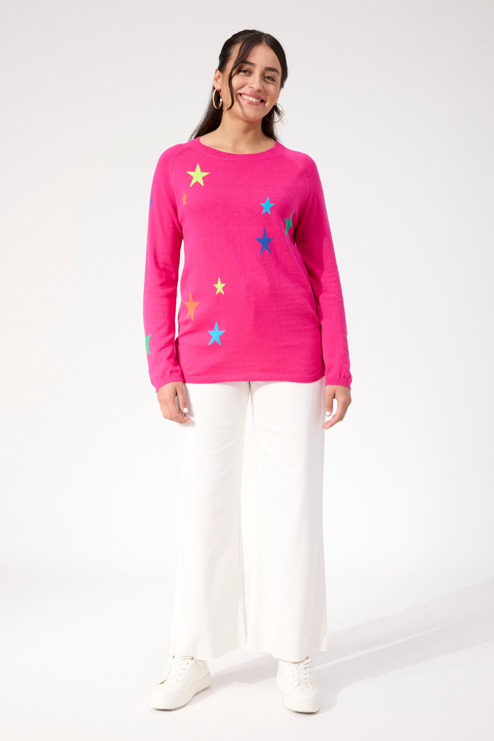 Make a statement with this vibrant hot pink crew neck jumper, elevated by playful multicoloured stars scattered across the front and sleeves. The perfect blend of bold colour and whimsical design, this knitwear piece brings personality to any casual wardrobe. Soft, comfortable, and undeniably eye-catching, it's an instant favourite for those who love standing out with style. Layer it effortlessly or wear it solo—this versatile jumper works beautifully with everything from denim to tailored trousers
